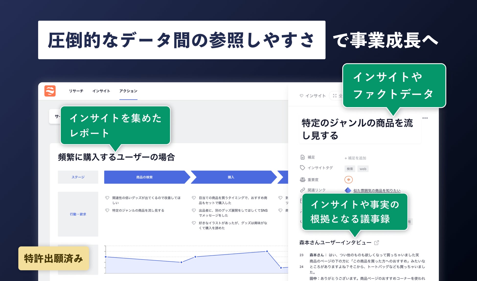 インサイトから根拠となる議事録、レポートからインサイトなど、あらゆるデータ間を参照しやすく接続することで、失敗できない意思決定のためにに必要な情報を瞬時に得ることができます。