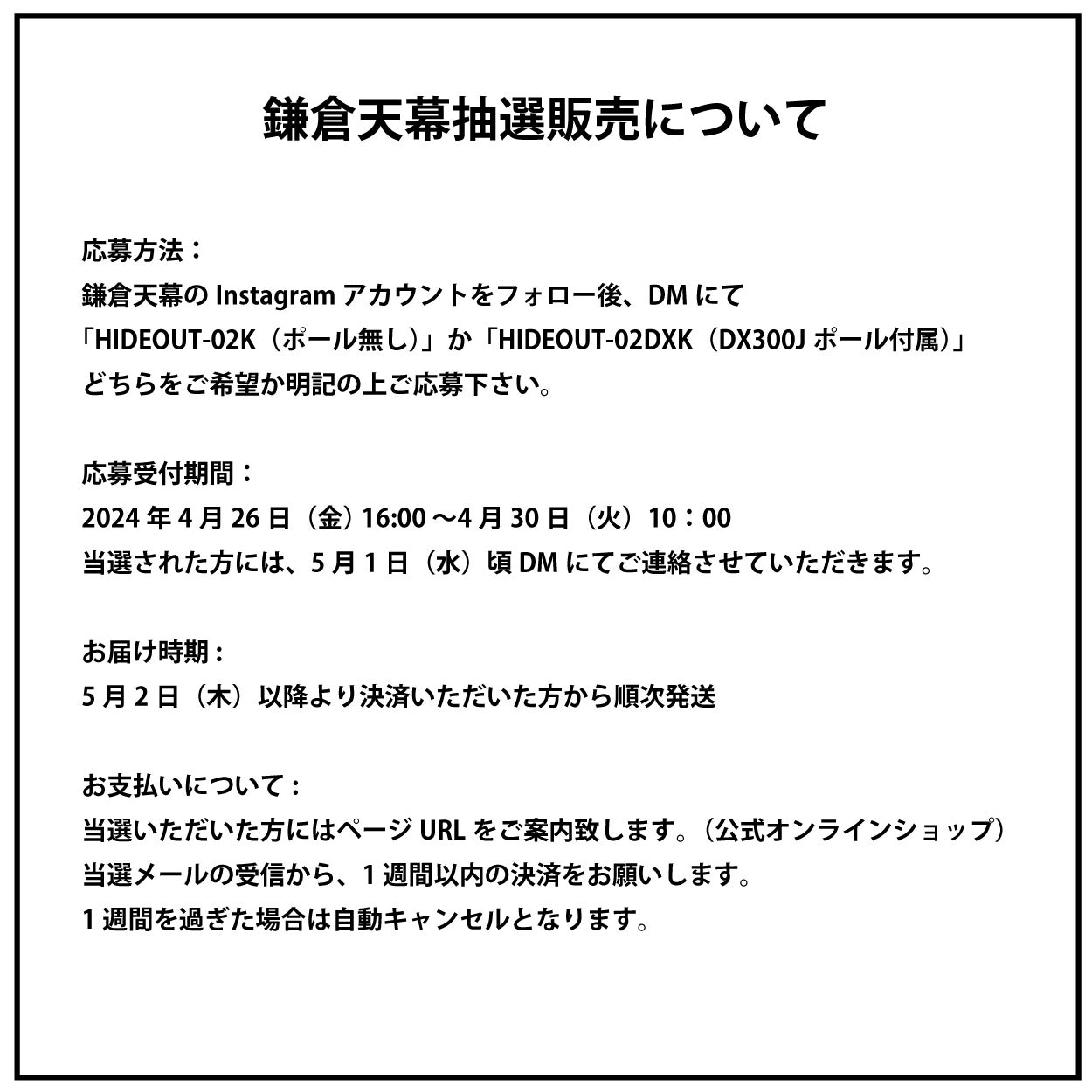 株式会社ニューテックジャパン(横浜市西区 代表取締役:白石 徳宏)は、4/26(金)16時より鎌倉天幕「HIDEOUT-02」<kotiモデル>の抽選販売を行います。