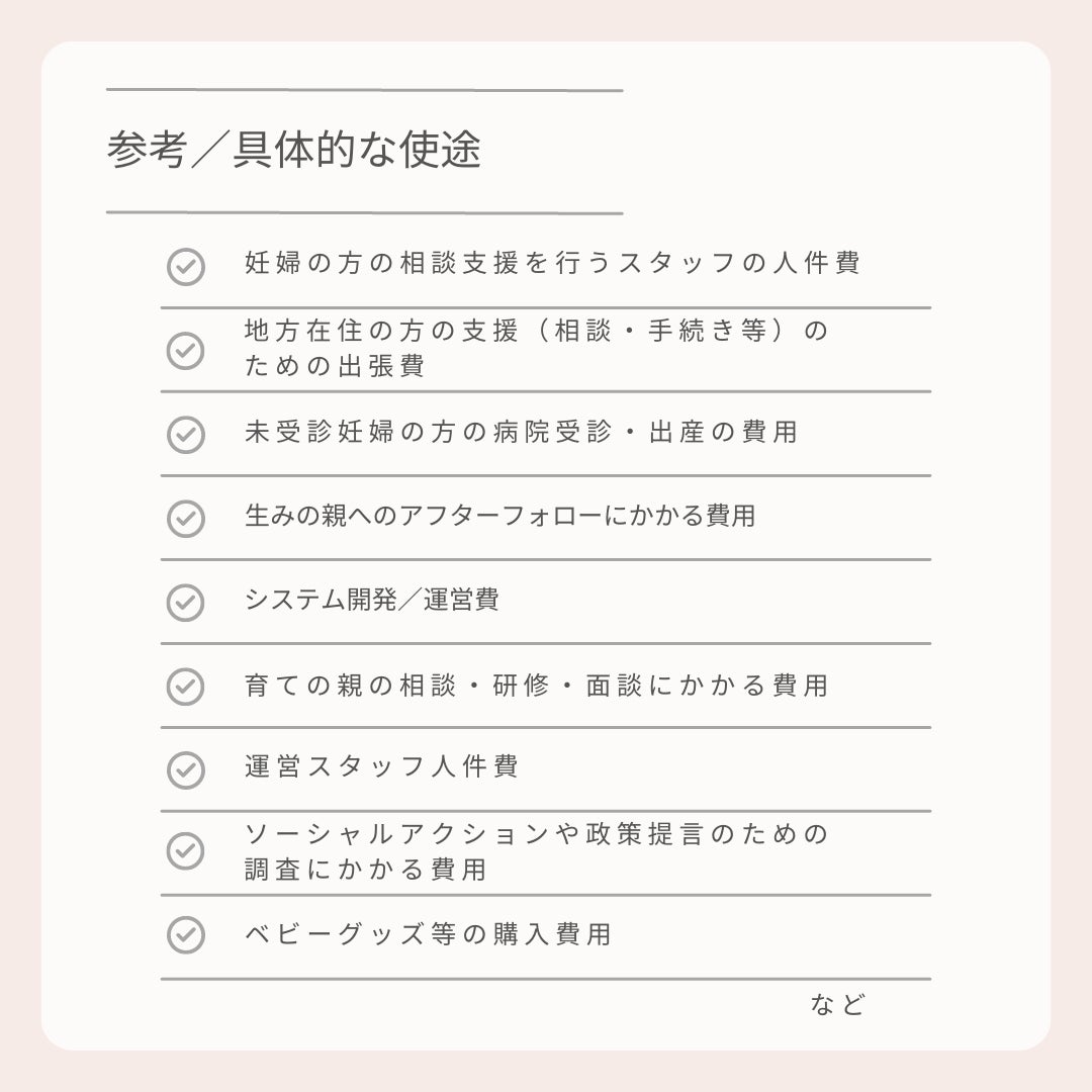 具体的な使途は幅広く、様々な目的(※画像参照)が含まれますが、例えば、HOPEのアイテム1点を購入すると、以下のような支援につながります。
