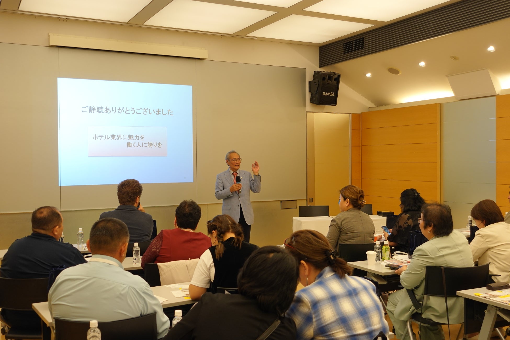 理事長・校長の石塚勉より、本校の創立背景やホスピタリティ教育、国際プログラム、実践的なカリキュラム構成、技能五輪への取り組みなどについて説明。視察団の皆様からは特に本校へ留学するための制度についての質問や、技能五輪全国大会・技能五輪国際大会への取り組みに関する質問が多く寄せられ、技能五輪国際大会(開催地:フランス/リオン)に本校卒業生が日本選手団として出場した実績の紹介時には、場内から拍手が沸き起こるなど、強い関心が寄せられました。