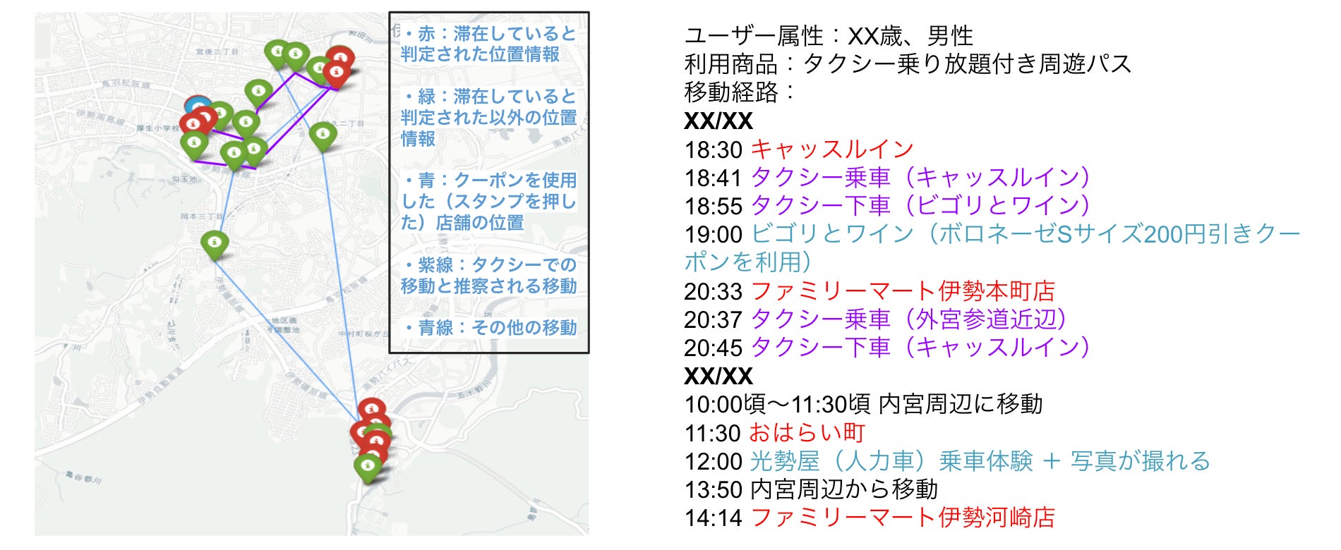 以下のような細かなユーザの移動・行動を把握することができます。またこれらデータを利用しユーザのエリア内滞在時間も把握できます。