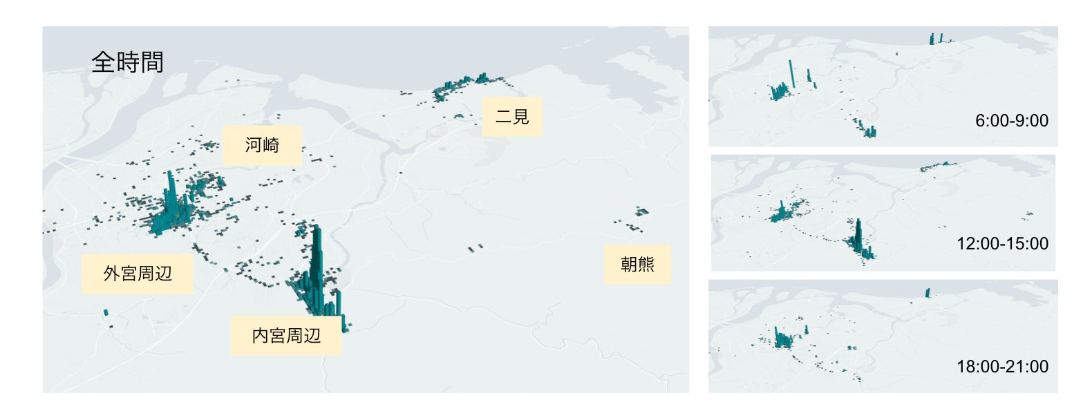 時間帯ごとにユーザがどこに多いか等も以下のように把握できます。属性別の可視化も可能です。