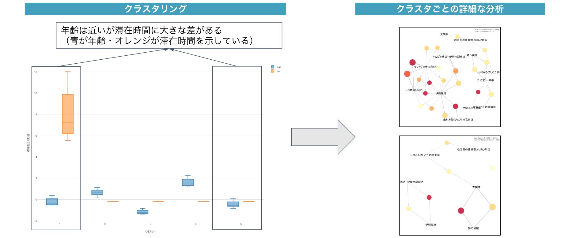 下図のように属性や滞在時間・購買金額などでクラスター分析を行うことで、ユーザのクラスタリングが可能です。また、クラスターごとの特徴を抽出することも可能です。