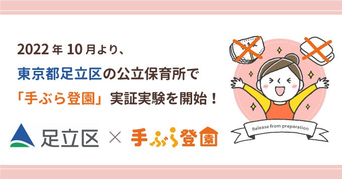 BABY JOB株式会社(本社:大阪府大阪市、以下当社)は、東京都足立区の公立保育施設において、当社とユニ・チャーム株式会社が提供する、保育施設向け紙おむつの定額サービス「手ぶら登園」の実証実験を、2022年10月より2か月間実施することをお知らせします。東京23区内では、渋谷区に続いて2番目の実証実験になります。