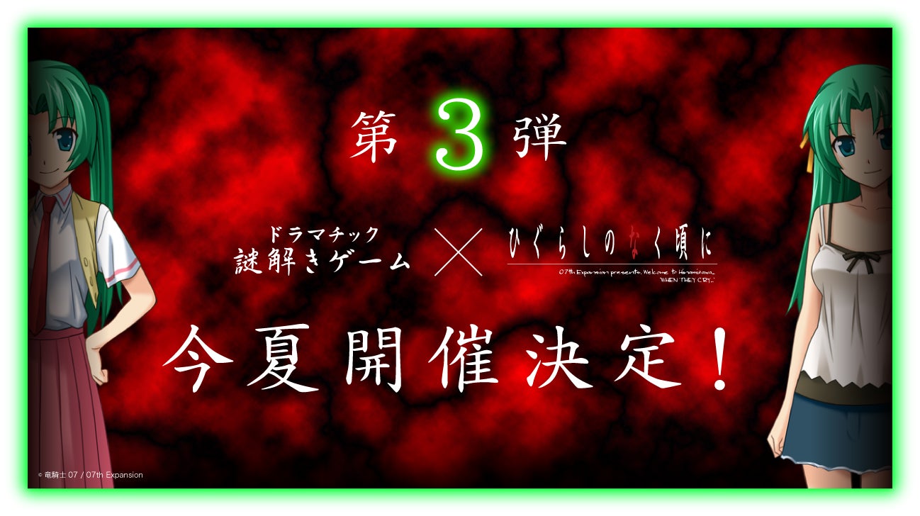 この「ひぐらしのなく頃に」とのコラボレーション謎解きシリーズは、2018年4月に開催された第1弾「竜宮レナ編」。2021年6月19日(土)に開催された第2弾「古手梨花編」に続き1年ぶりの新作となります。