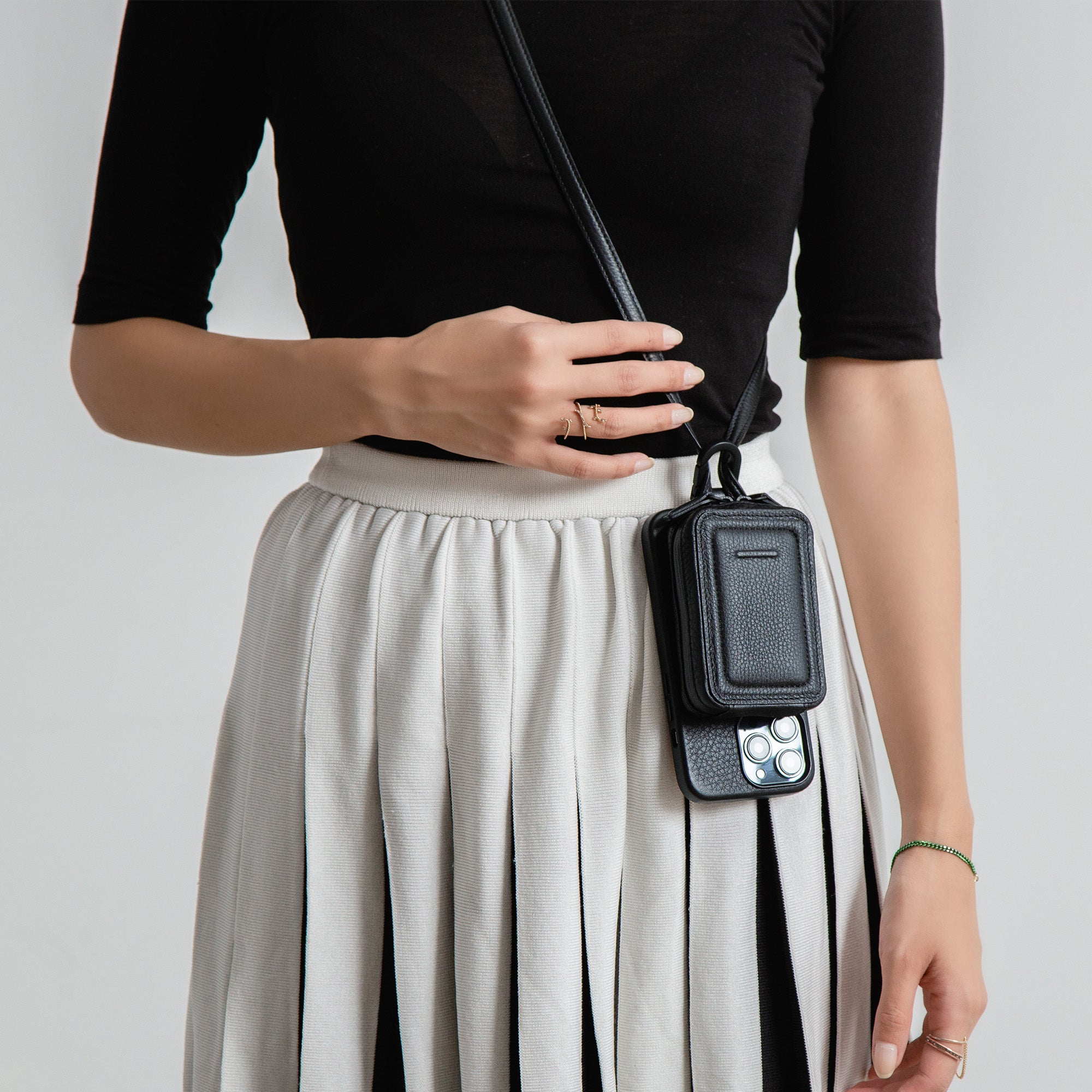 また、本体ケースとストラップ一体型アクセサリーは、MagSafeの磁力とカラビナの2箇所で接続する仕様。持ち歩く際は、iPhoneケースの下部に設けたカラビナにストラップを通すことで安心して身につけられます。