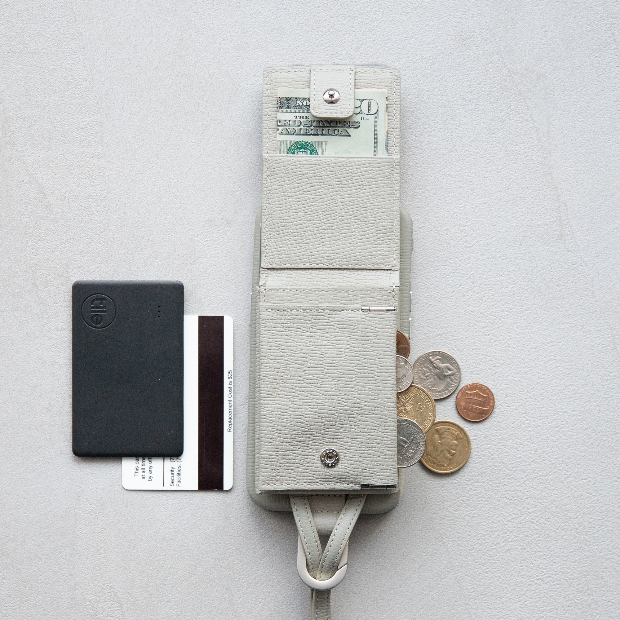 「ウォレット」は、縦と横に二重に開閉する仕様で、札入れ・コインポケット・カードポケットを備えています。三つ折りの紙幣5枚・硬貨10枚・カード2〜3枚を収納できるほか、コインポケットにはAirTagも収納可能。必要最低限のキャッシュも持ち歩けるため、ちょっとした外出に適したアクセサリーです。