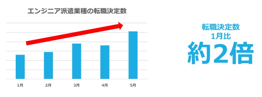 開発エンジニアにおける採用ニーズが高まりを見せています。特に、5月はエンジニア派遣業種での転職決定数が1月比で約2倍伸長しました。