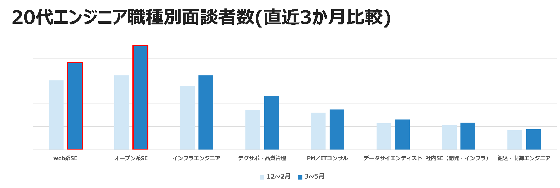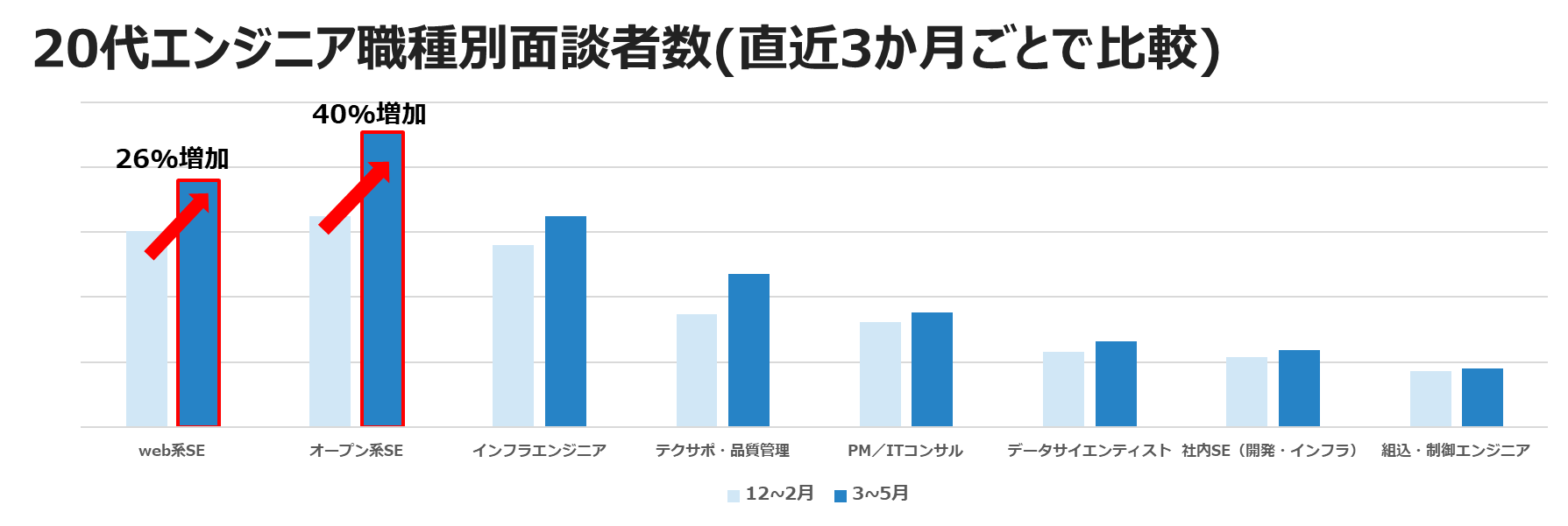 20代エンジニアに絞り職種別増加傾向を直近3か月ごとで比較した結果、開発エンジニア(下流)の集客数が増加していました。