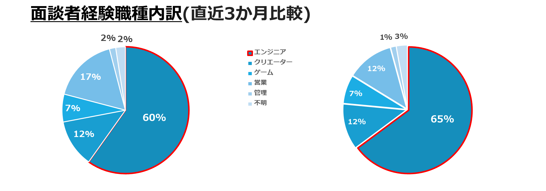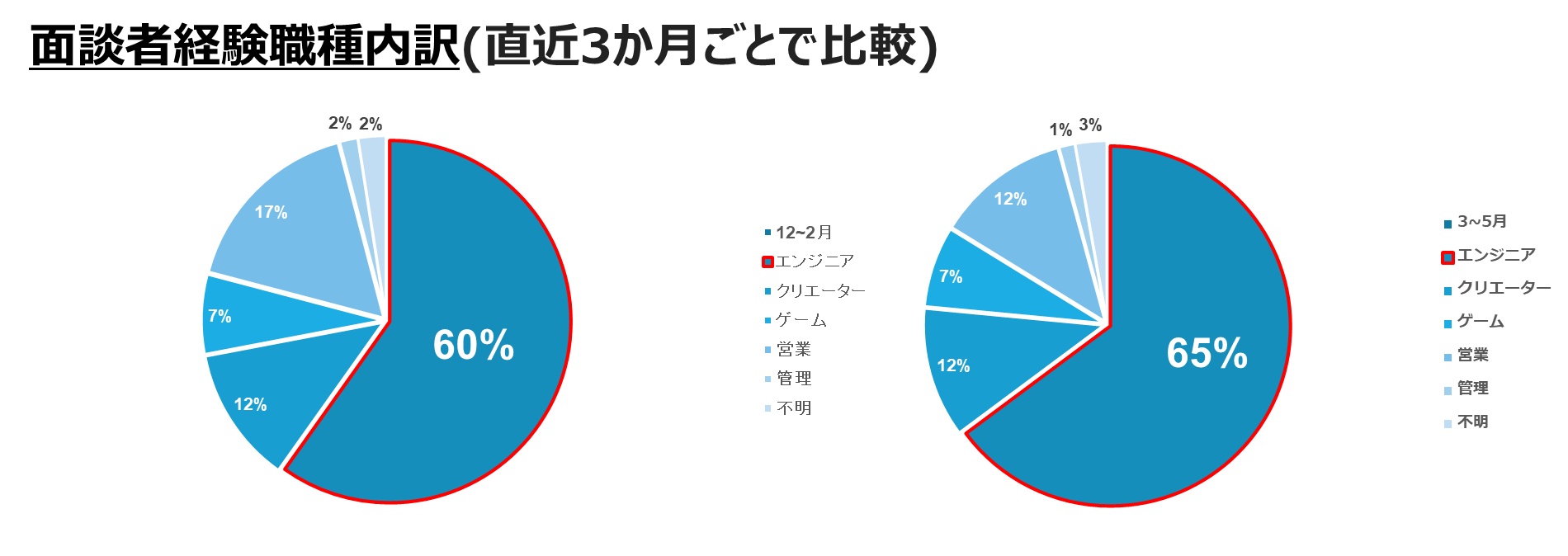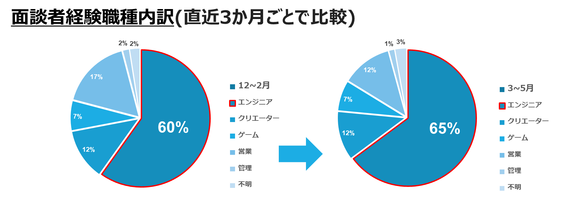 面談者経験職種の内訳では、エンジニアの比率が60%から65%に増加しています。