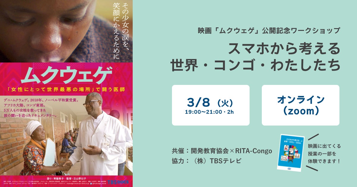 認定NPO法人開発教育協会(東京都文京区、代表:湯本浩之)では、NPO法人RITA-Congoと共催で3月8日(火)に映画『ムクウェゲ』公開記念ワークショップ「スマホから考える世界・コンゴ・わたしたち」を開催します。