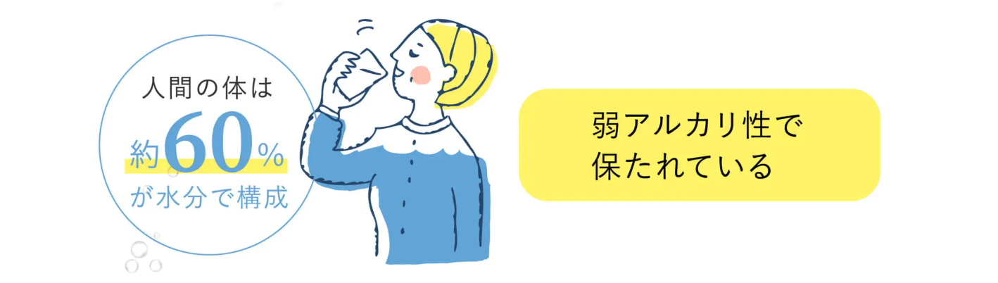 人の体は約60%が水分で構成されているのは知っていますか?pH値(水素硫黄指数)は基本弱アルカリ性で保たれています。体液が弱アルカリ性の状態でないと、全身の細胞は機能を発揮できないと言われています。