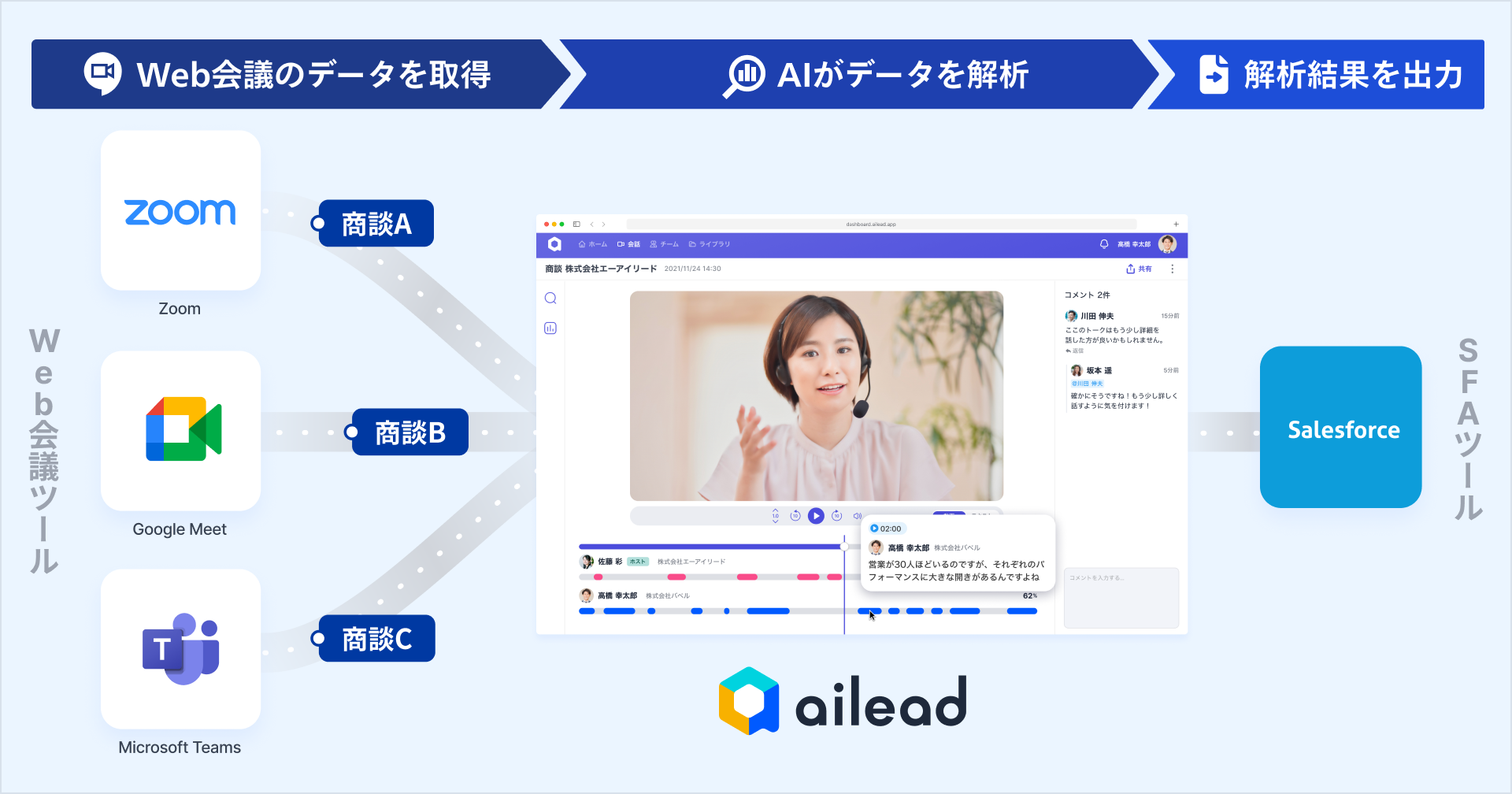 ailead(エーアイリード)は、商談解析クラウドです。AIが商談データを自動で収集・解析・可視化することで、営業現場の業務効率化と「売れる」営業人材の育成を実現します。お使いのWeb会議ツールと連携することで、既存の業務フローを全く変えずにご利用が可能。様々な業界の企業のセールスイネーブルメントに貢献します。