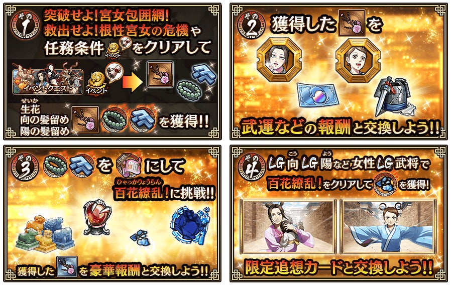 LG黒桜や、LG向・LG陽などの女性LG武将で『百花繚乱!』をクリアしてイベント限定追想カードの交換に必要な『追想引換券のかけら』を獲得しよう!
