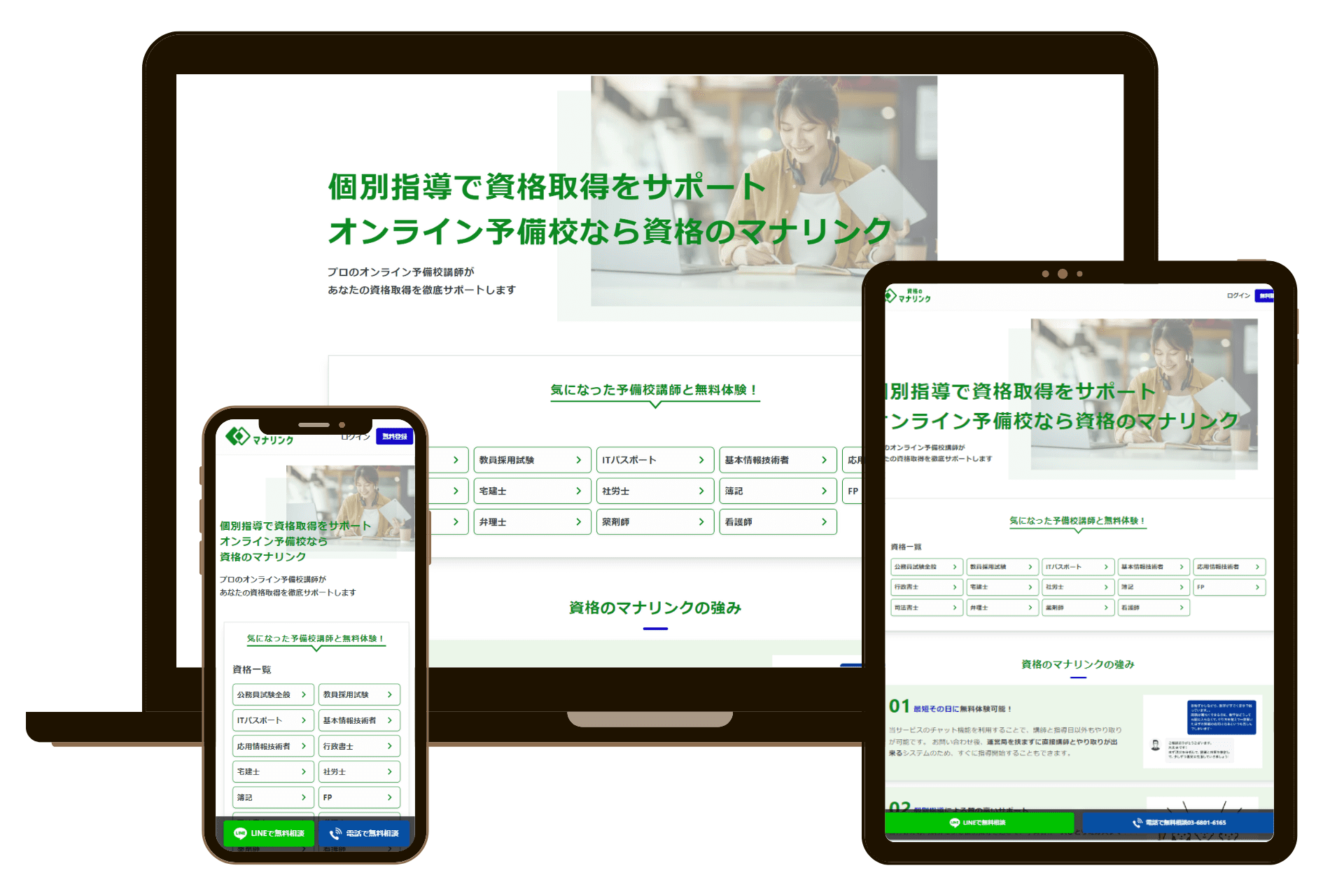 時間制約のある社会人や子育て中の方が資格取得を目指す過程には、オフラインの予備校に通う時間がない、独学で頑張ろうとしたが途中であきらめてしまう、という場面も見受けられます。そこで、私たちは「マナリンク」を通じて培ったマンツーマン指導のノウハウとオンライン教育の特性を最大限に活かし、一人ひとりにあわせたキャリアアップや就職への道を応援していきます。