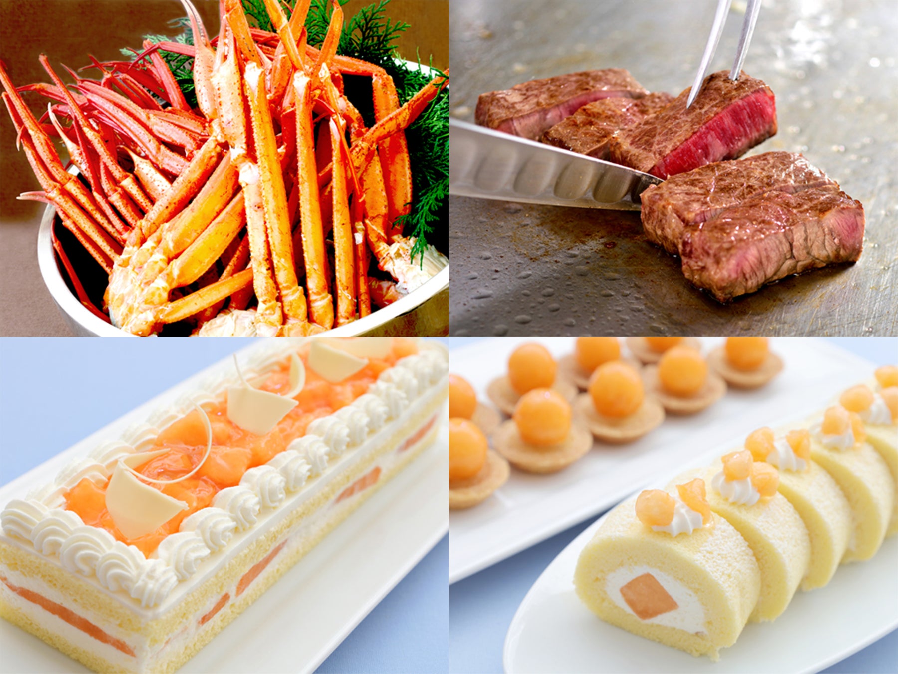 食べ放題の本ズワイ蟹と北海道産牛のステーキをはじめ、ザンギなどの北海道の定番メニュー、北海道産の魚介類や夏に旬を迎える農産物を使った料理、富良野メロンスイーツなど、多彩なメニューをご用意いたします。
