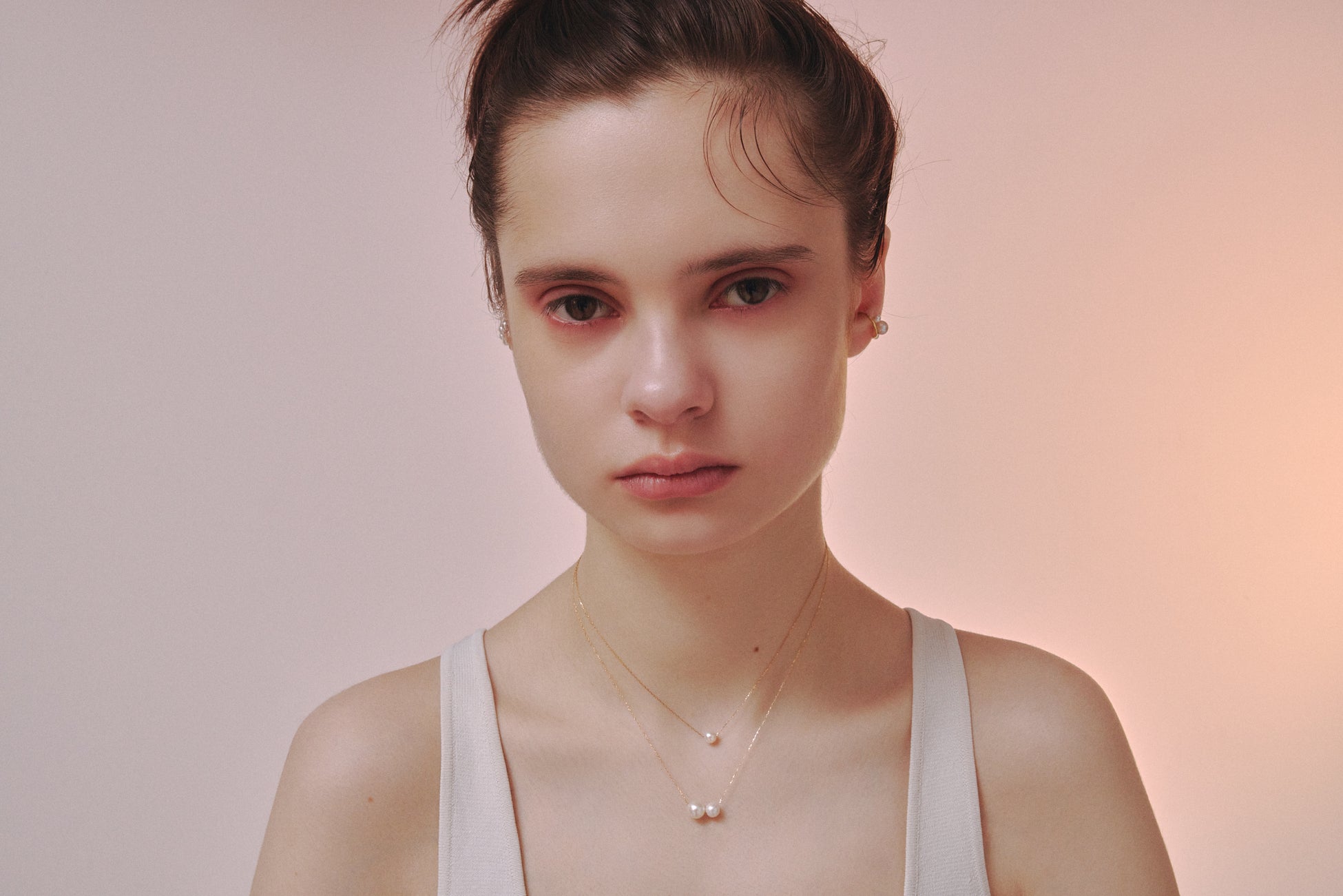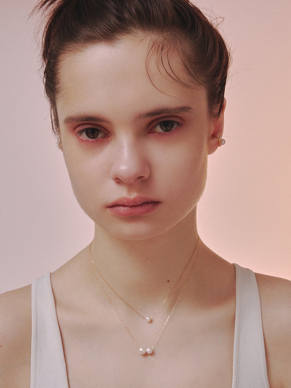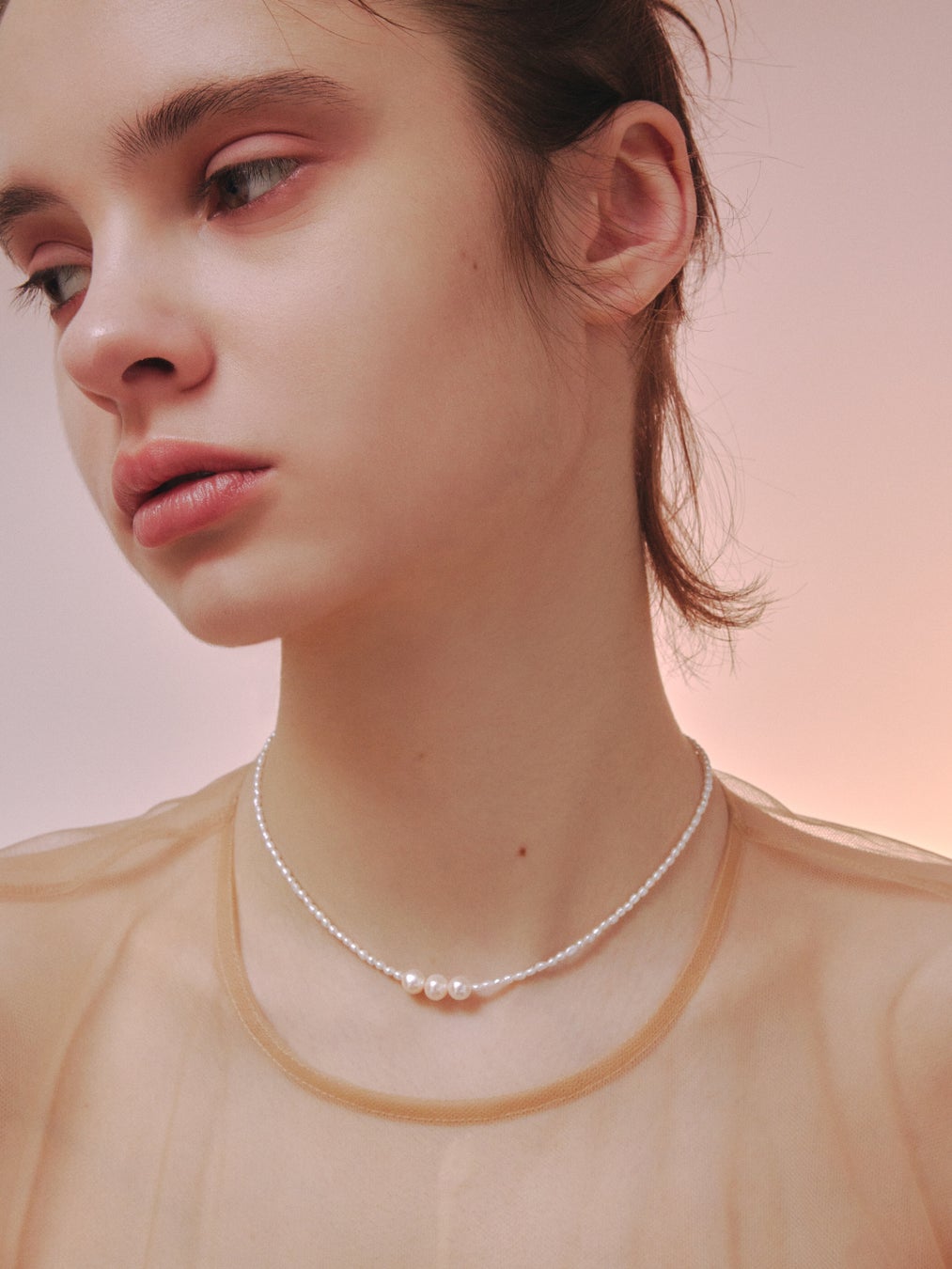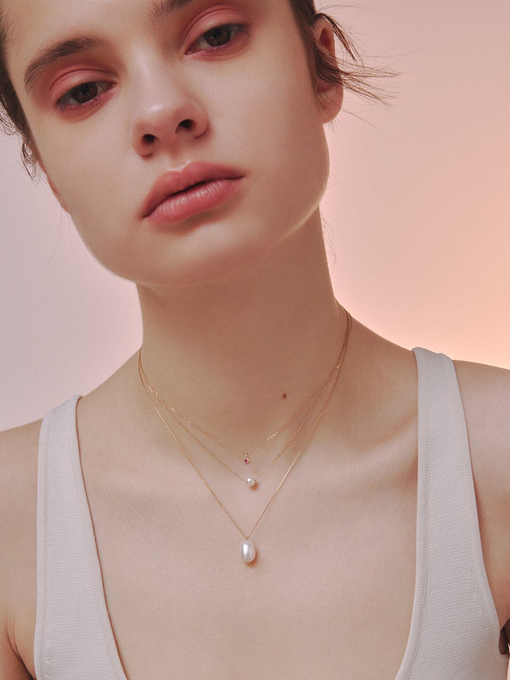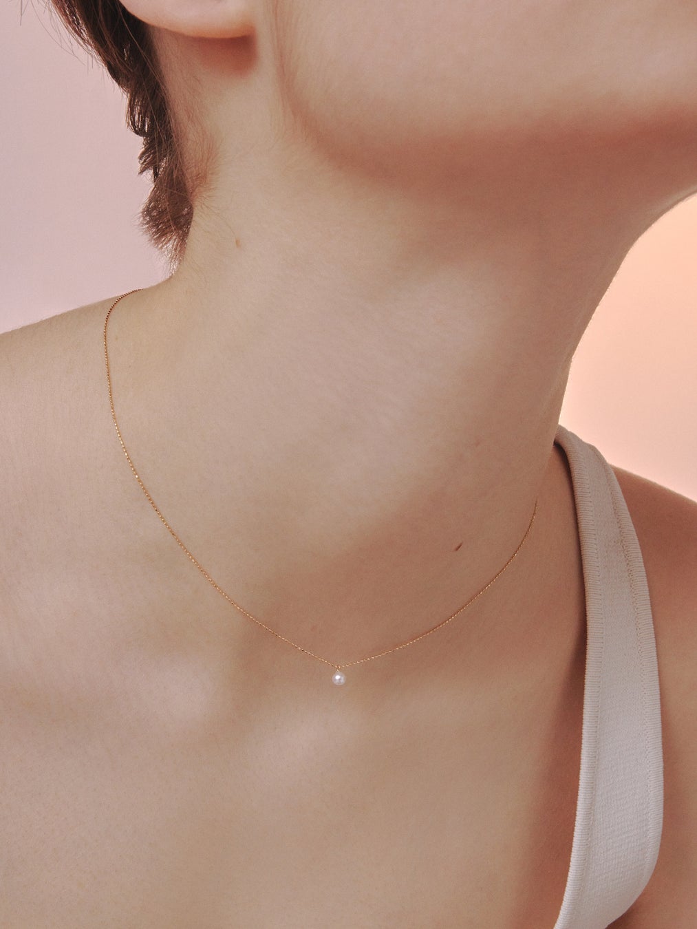 肌の上でオブジェのように浮かぶパールが際立つネックレスや、