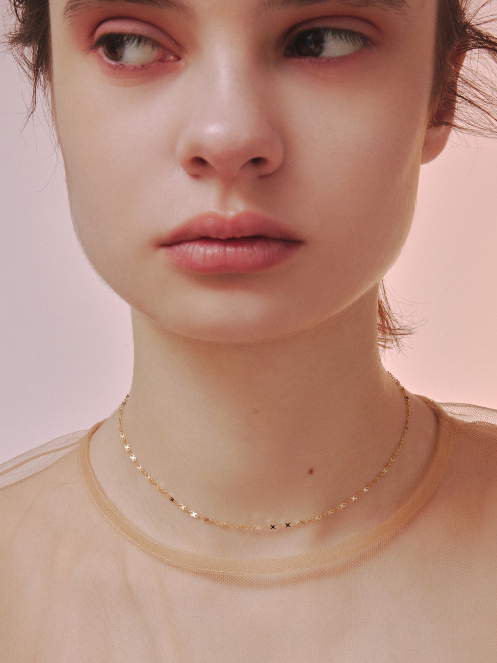 星屑を散りばめたような繊細な輝きが美しく、未知の自分へと駆り立てる神秘的なオーラを纏うように肌に寄り添うネックレス。