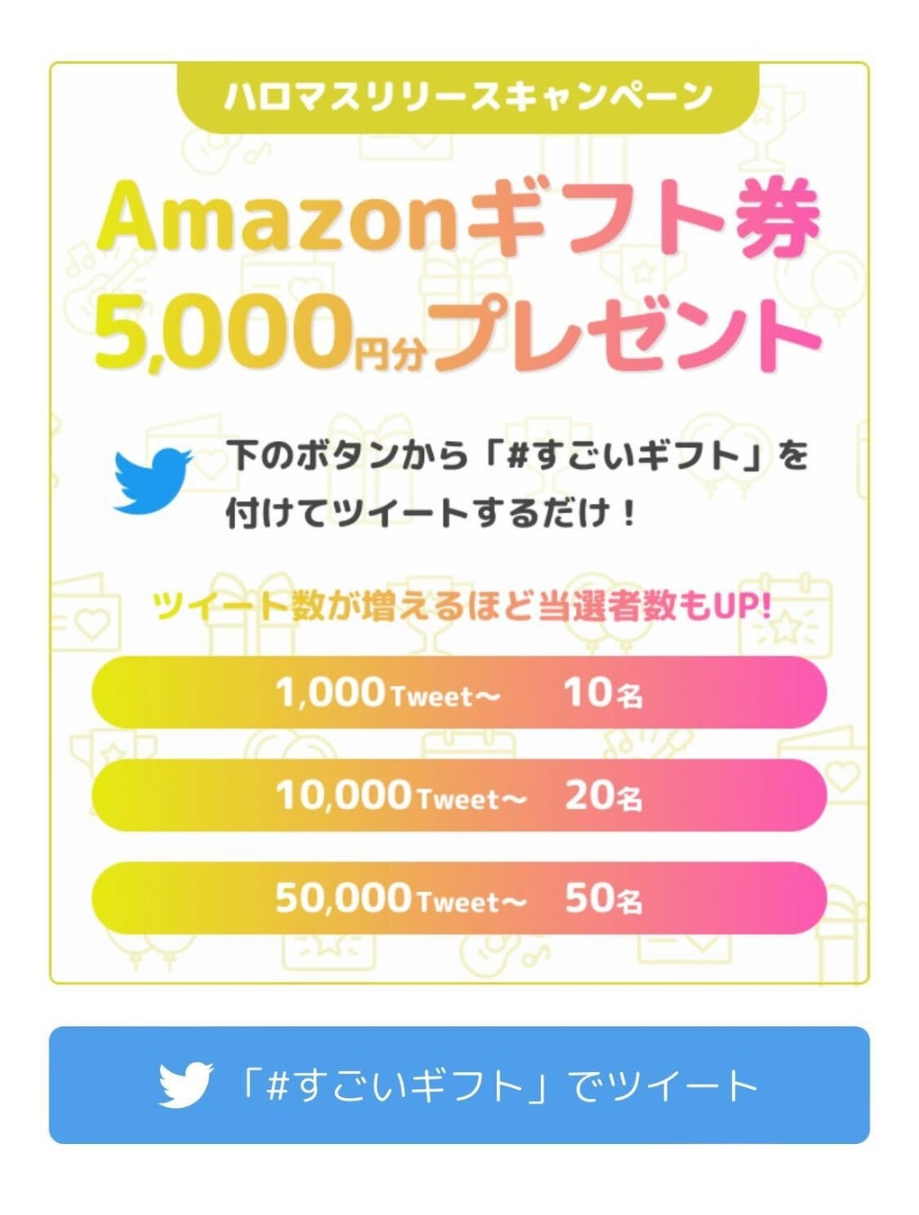 また合わせて、「すごいギフト」商品一覧ページのシェアボタンからツイートするだけで、抽選で10名様以上にAmazonギフト券5,000円分をプレゼントする「ハロマス」リリース記念キャンペーンを実施いたします。
