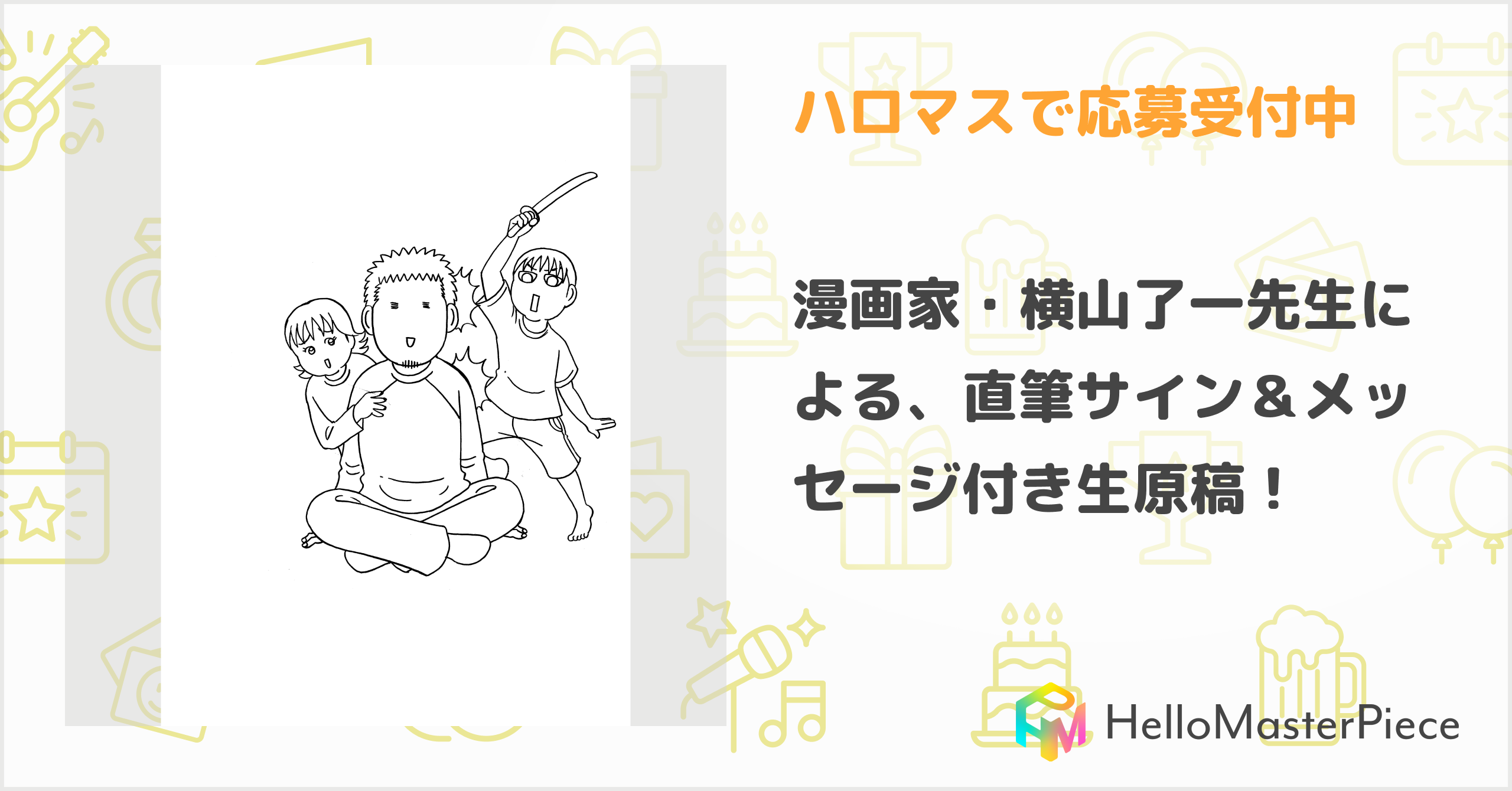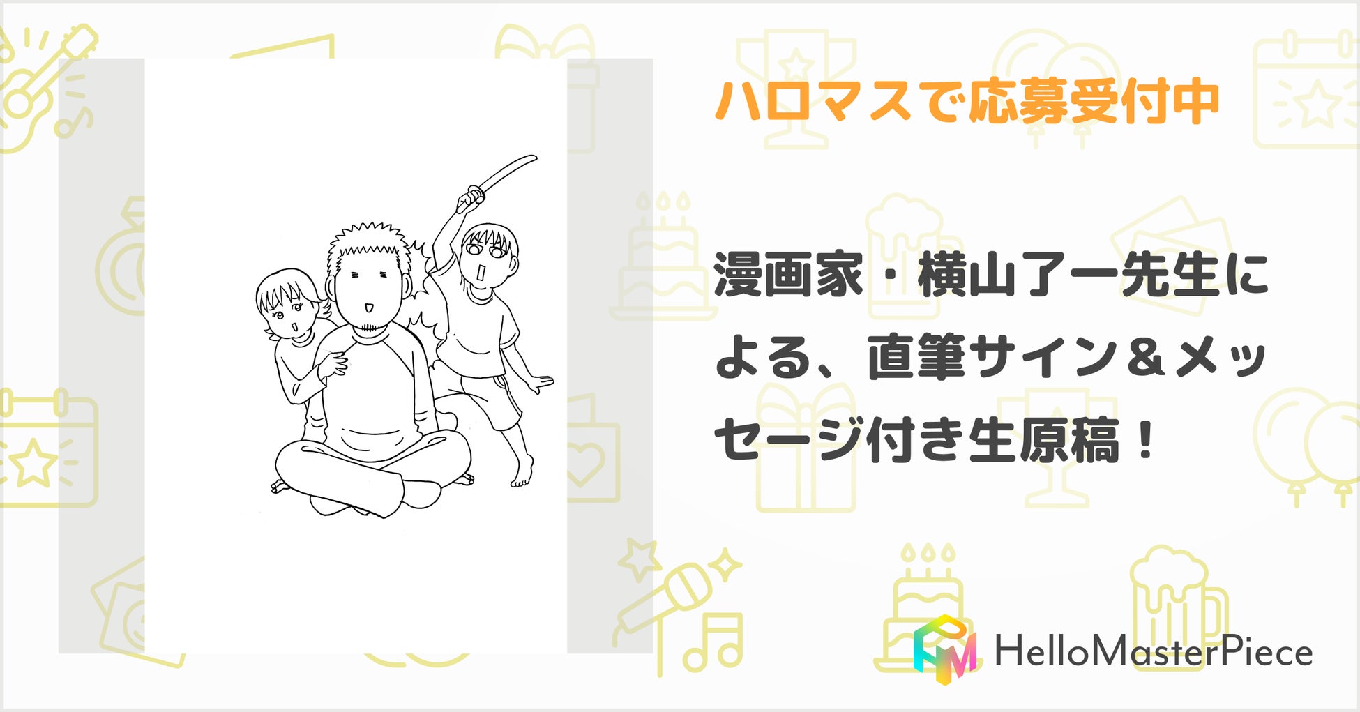 『きょうの横山家』『戦国コミケ』『新しいパパがどう見ても凶悪すぎる』などの作者で漫画家の横山了一先生による、本人のサインとあなたへのオリジナルメッセージ入りの生原稿を購入できるすごいギフトです。