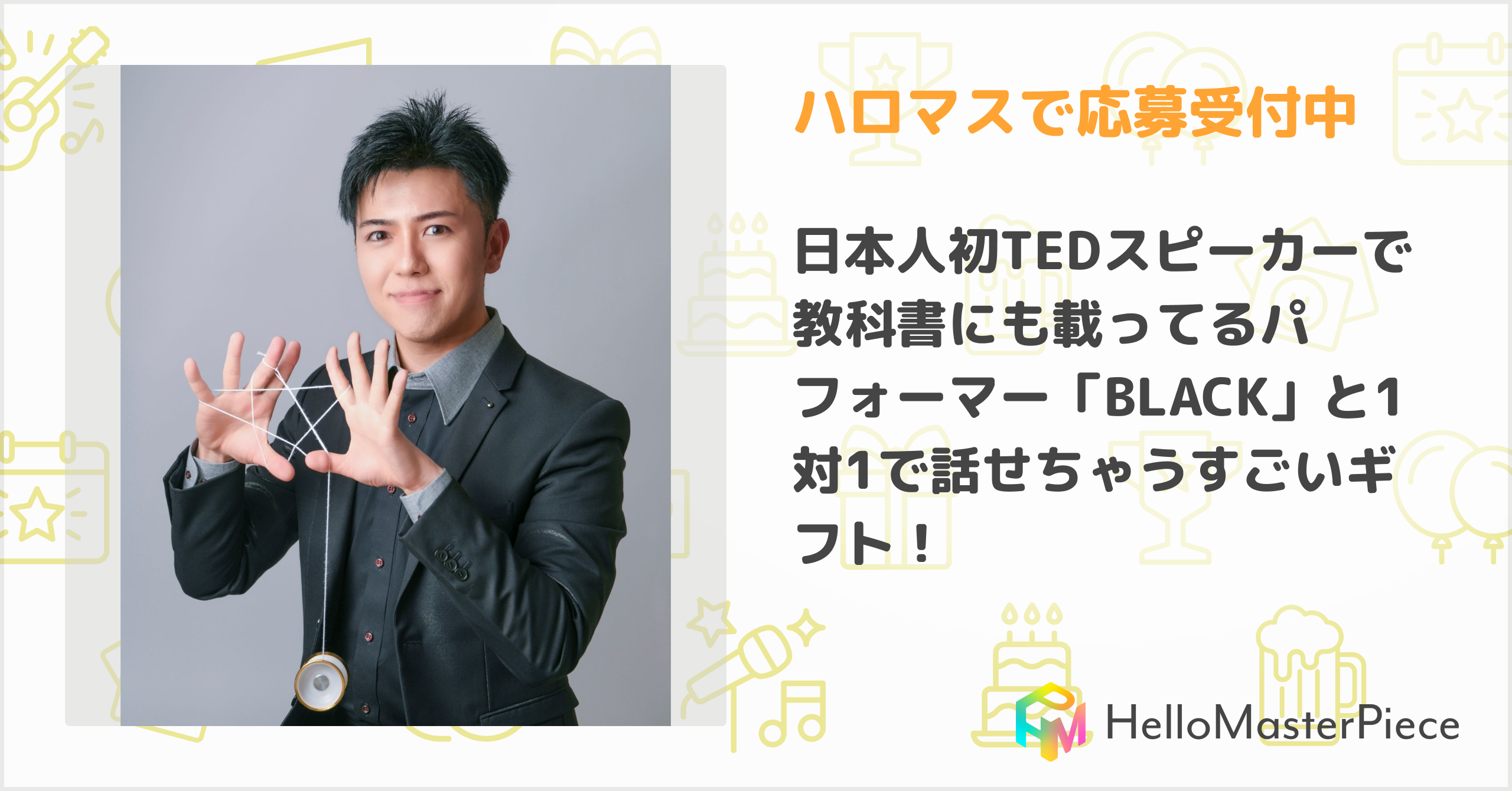 日本初の偉業をいくつも打ち立てており、世界でも活躍する「ヨーヨーパフォーマーBLACK」と60分間オンラインでお話しできちゃう限定1枠のすごいギフトです。