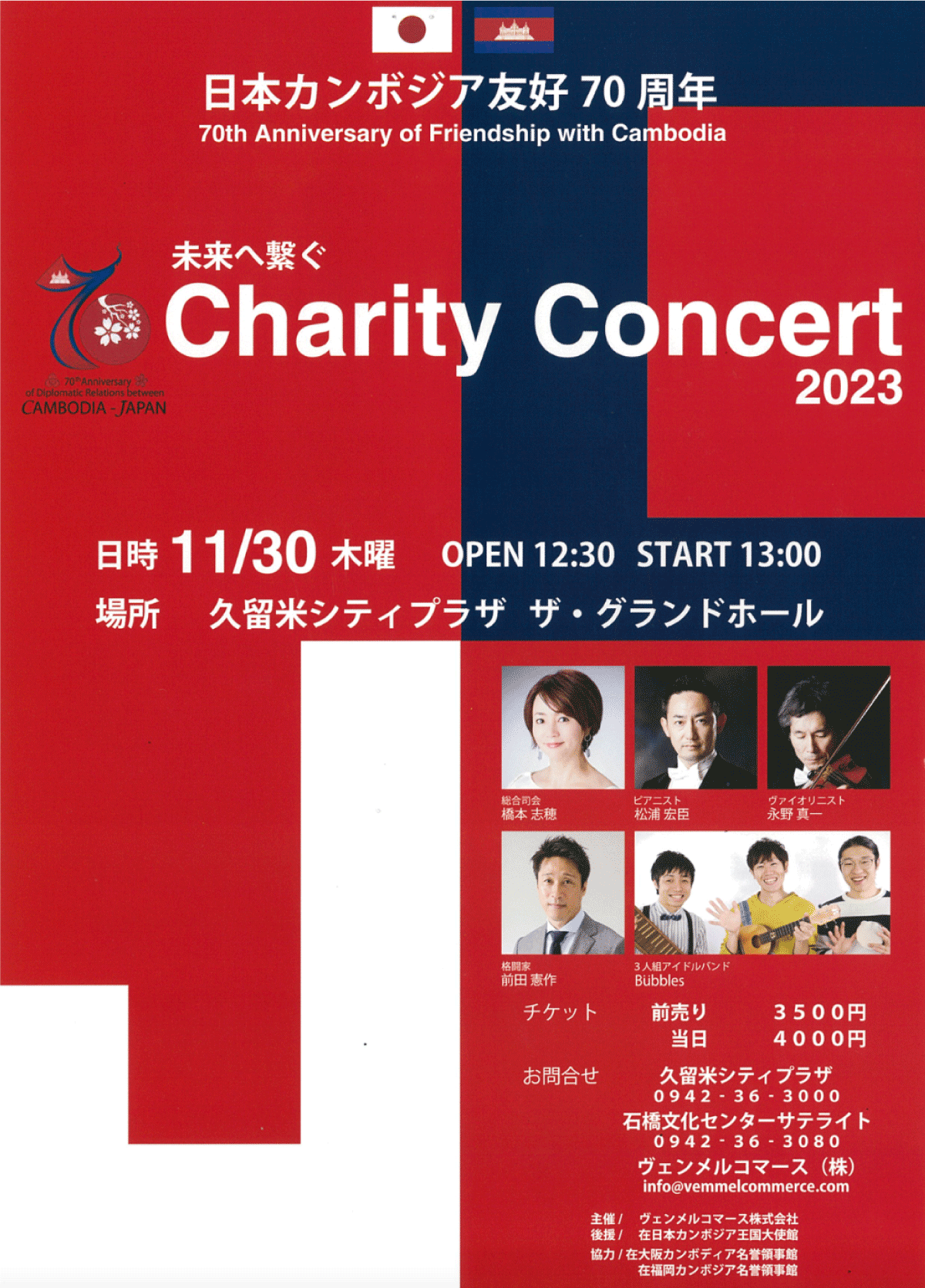 日本カンボジア友好 70周年チャリティーコンサートは在日本カンボジア王国大使館後援、ヴェンメルコマース株式会社(本社:東京都千代田区、代表取締役:中村博文)が主催する記念コンサートです。ピアニスト、バイオリニスト、アイドルバンドが集結し、各界一流の方々のパフォーマンスをお楽しみいただけます。