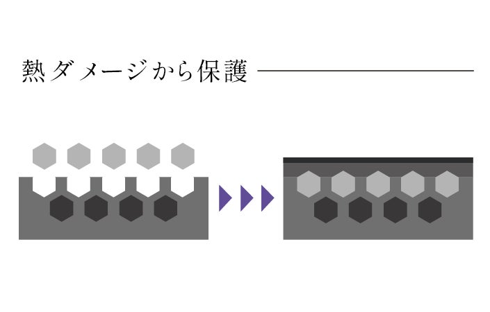 ドライヤーの時間が短縮されるとともに、「保護膜」がドライヤーの熱を遮断することで髪が受ける熱のダメージが軽減されます。