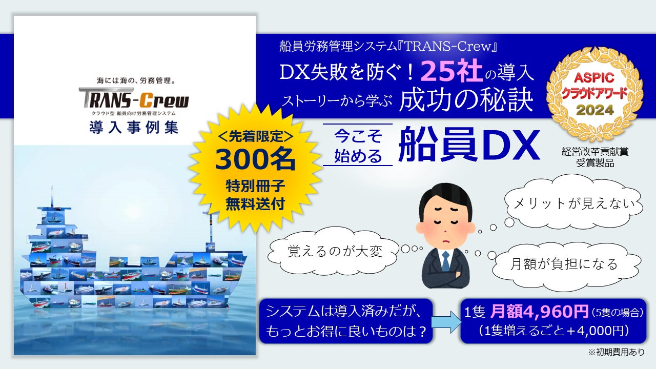 株式会社エイ・アイ・エス(本社:東京都千代田区、代表取締役:大浦博、以下「AIS」)は、船員DXの成功の秘訣をまとめた特別冊子を、300名限定でプレゼントいたします。