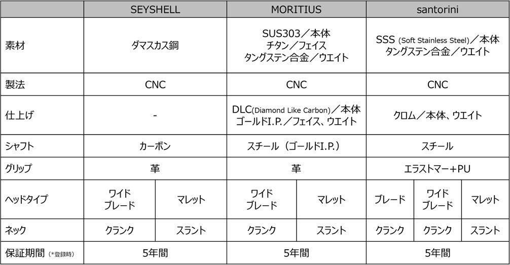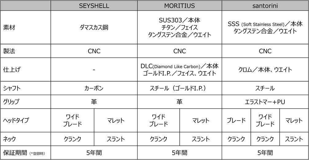 3シリーズはそれぞれ世界有数のリゾートアイランドでの特別な体験を連想させる、プレミアムなコレクションです。セーシェルはインド洋の真珠と呼ばれ、人生で一度は訪れるべきと言われるほどの美しい諸島。そこからインスピレーションを受け、稀少な素材であるダマスカス鋼を贅沢に使用した究極のパターを作り上げました。モーリシャスは、レースに縁どられたようなサンゴ礁に囲まれ、神が天国のモデルにしたと評されたインド洋の島国です。打感、デザインともに天に上るような心地よさを持つ贅沢なパターを完成させました。さらに、サントリーニは青いエーゲ海に囲まれ、ブルードームと呼ばれる白い壁と青い屋根で知られる地中海屈指の人気リゾート。その整えられた美しさから、優れた機能美をパターで表現しました。