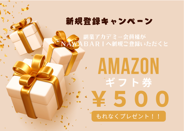 副業アカデミーのメールマガジン購読者でNAWABARIへ新規登録された方に、Amazonギフト券500円分をプレゼントいたします。