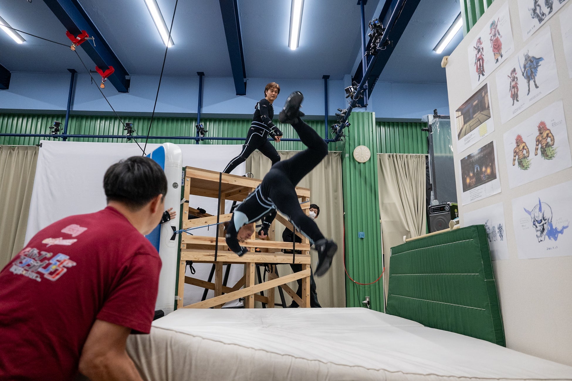 公開イベントは、モーションキャプチャー収録が行われている現場を見学する形で始まり、モーキャプアクターは、ディレクターのオーダーに対応して、その場でアクション、殺陣を組み立てていく。ライブ感を持って、スタッフと一緒に台座を押さえるなどの観客参加型で、その場でアクションシーンが出来上がっていく様子、難易度の高いパフォーマンスが見られると、客席からは歓声が上がった。実際の現場でも、モーキャプアクターはディレクターと会話を重ねつつシーンを作り上げていくが、それをショーとして公開する手法だ。