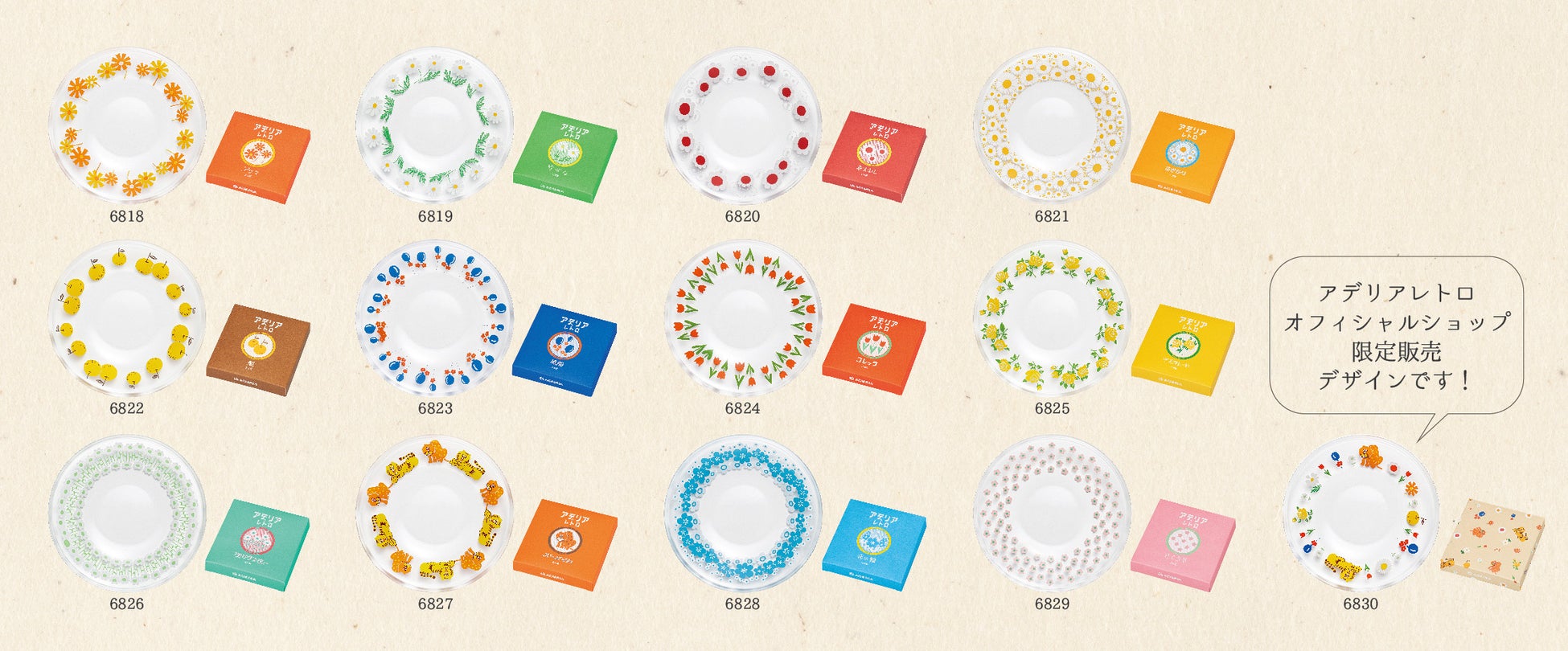 ラインナップは定番12柄+アデリアレトロオフィシャルショップ限定柄の13柄。限定柄はアデリアレトロ初の人気柄ミックスで、オフィシャルショップでしか買えない貴重なアイテム。ぜひ一度ご覧ください。