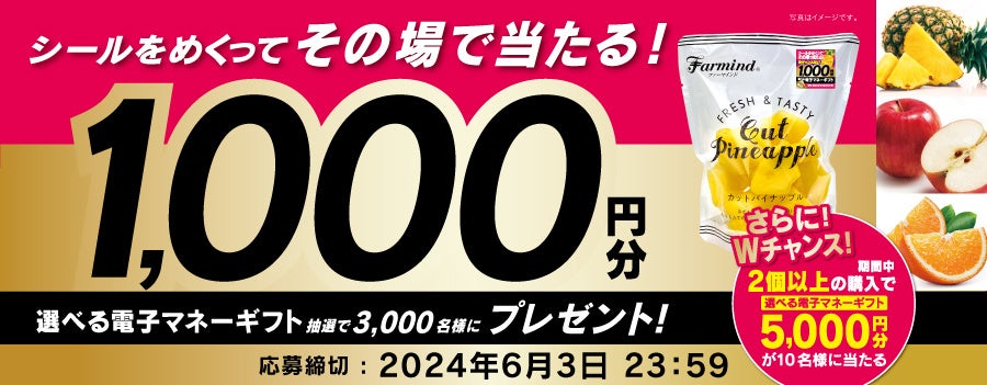 青果の総合流通企業の株式会社ファーマインド(本社:東京都千代田区、代表取締役社長:堀内達生)は、2024年4月1日(月)より、選べる電子マネーギフト1,000円分が3,000名様に当たる『その場で当たりがわかるカットフルーツキャンペーン』を実施いたします。