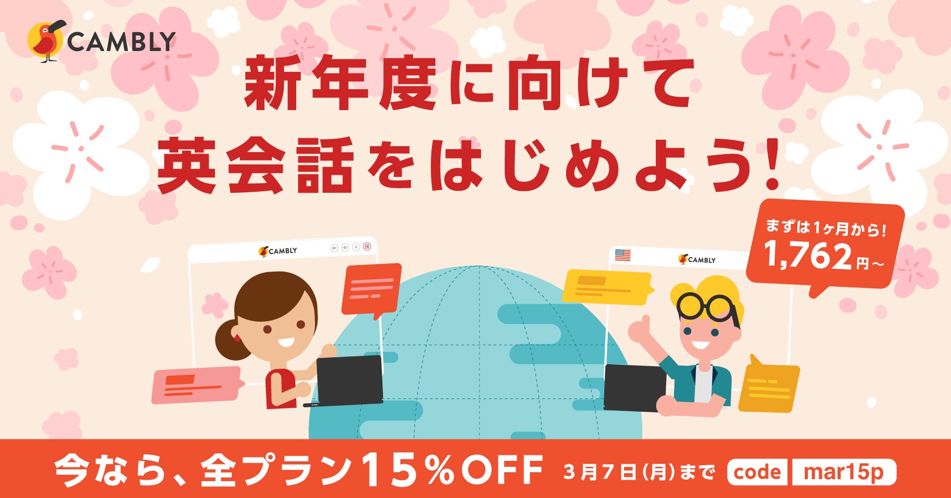 Cambly Inc.(本社:アメリカ・サンフランシスコ、日本代表:佐藤 亜希子)が提供するネイティブ講師とのオンライン英会話サービス「CAMBLY(キャンブリー)」は、3月3日(木)から3月7日(月)までの5日間、全プラン15%OFFセールを開催いたします。