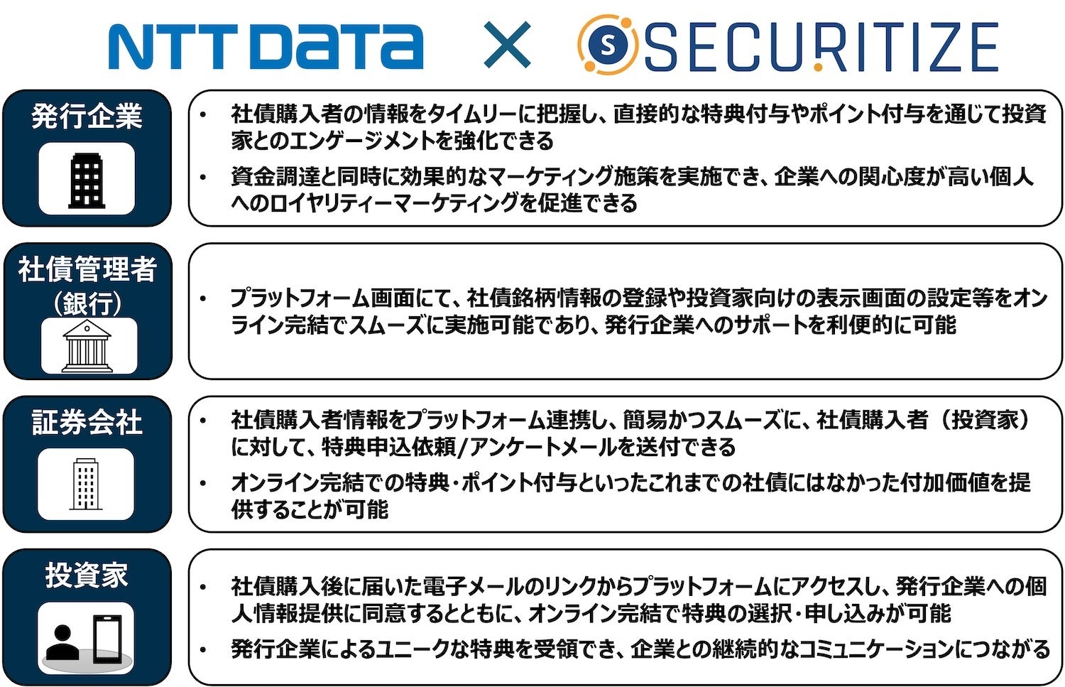 株式会社NTTデータ(本社:東京都江東区、代表取締役社長:佐々木 裕、以下:NTTデータ)と、セキュリティ・トークン(以下、ST)/デジタル証券の発行・ライフサイクル管理プラットフォームを提供するSecuritize Japan株式会社(本社:東京都中央区、代表取締役:ジェームス・エイチ・フィン、以下、Securitize)は、デジタル証券プラットフォームサービスを共同で始動します。その第一弾として、社債に対して商品・ポイントなどの特典を、発行企業から投資家に直接付与するためのサービス「社債購入者情報提供サービス」の提供を開始します。