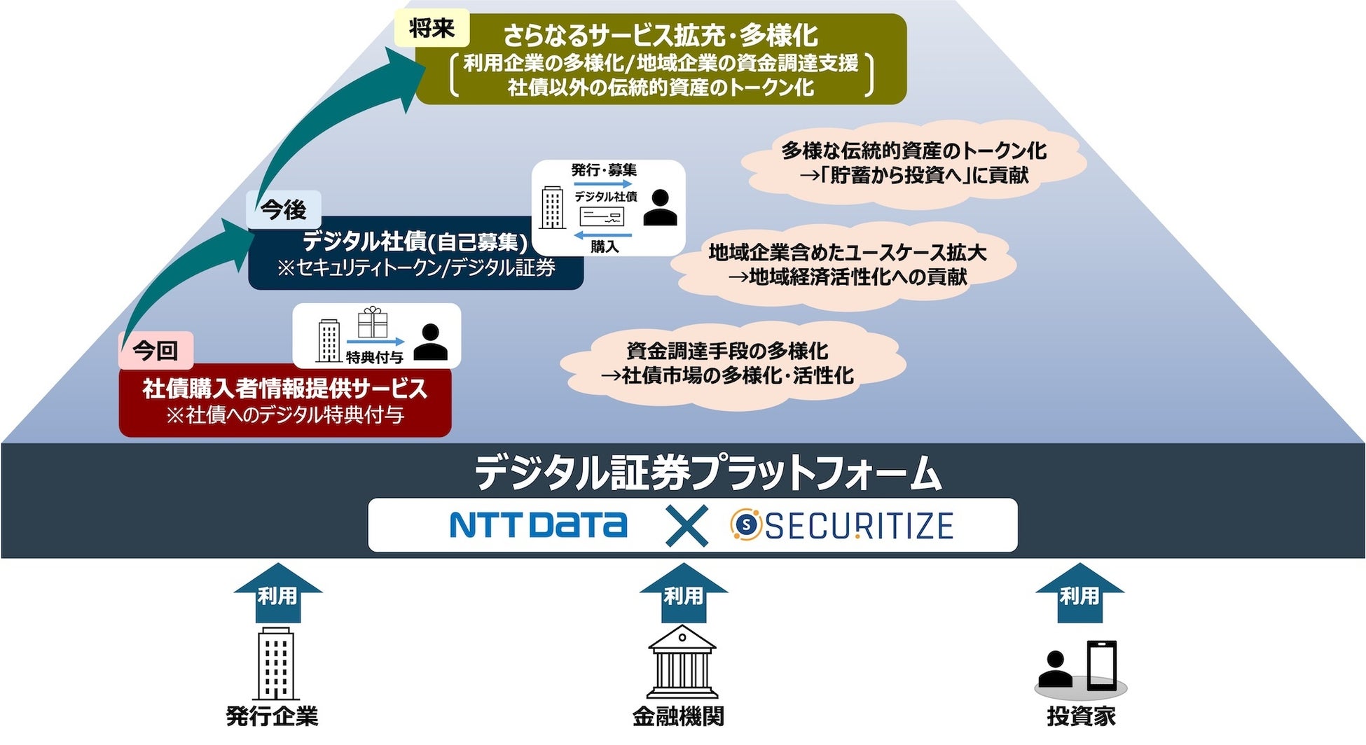 なお、Securitizeプラットフォームの投資家管理機能・特典機能等を活用し、NTTデータの幅広い顧客基盤を生かした案件誘致を進めるとともに、社債管理者となる銀行や、本サービスを利用する発行企業、証券会社との共創についても推進してまいります。