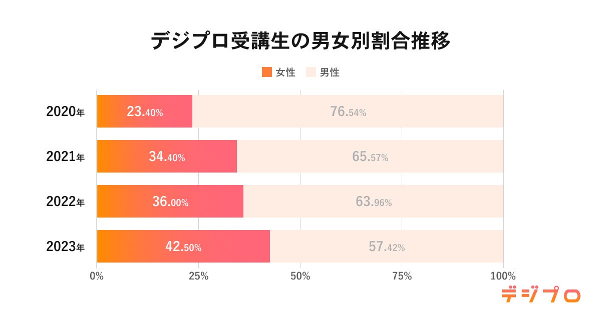 デジプロの女性受講生の割合は4年で約180%増加(2020年23.4%→2023年42.5%)。