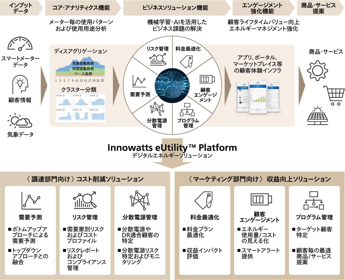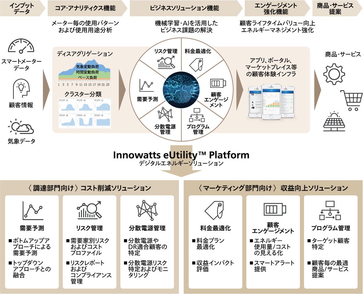 Innowatts, Inc.は、世界の4500万件以上のスマートメーターデータを最高峰のAIを活用し、電力事業者の顧客に対するビジネスチャンスの獲得支援や顧客価値の向上、エネルギー変革の推進を支援する、エネルギーSaaSプラットフォームのリーディングカンパニーです。複数の異なるデータの分析によって、拠点ごとのCO2排出量および原単位を把握することが可能です。イノワッツのプラットフォームは、かつてない精度でカスタマーセントリックなエネルギー分析をリアルタイムで提供します。アメリカ、ヨーロッパ、アジアに事業展開し、エネルギープロバイダーが真の顧客中心志向となり、データの力を十分に活用して事業を変革できるよう支援するグローバル・リーダーです。