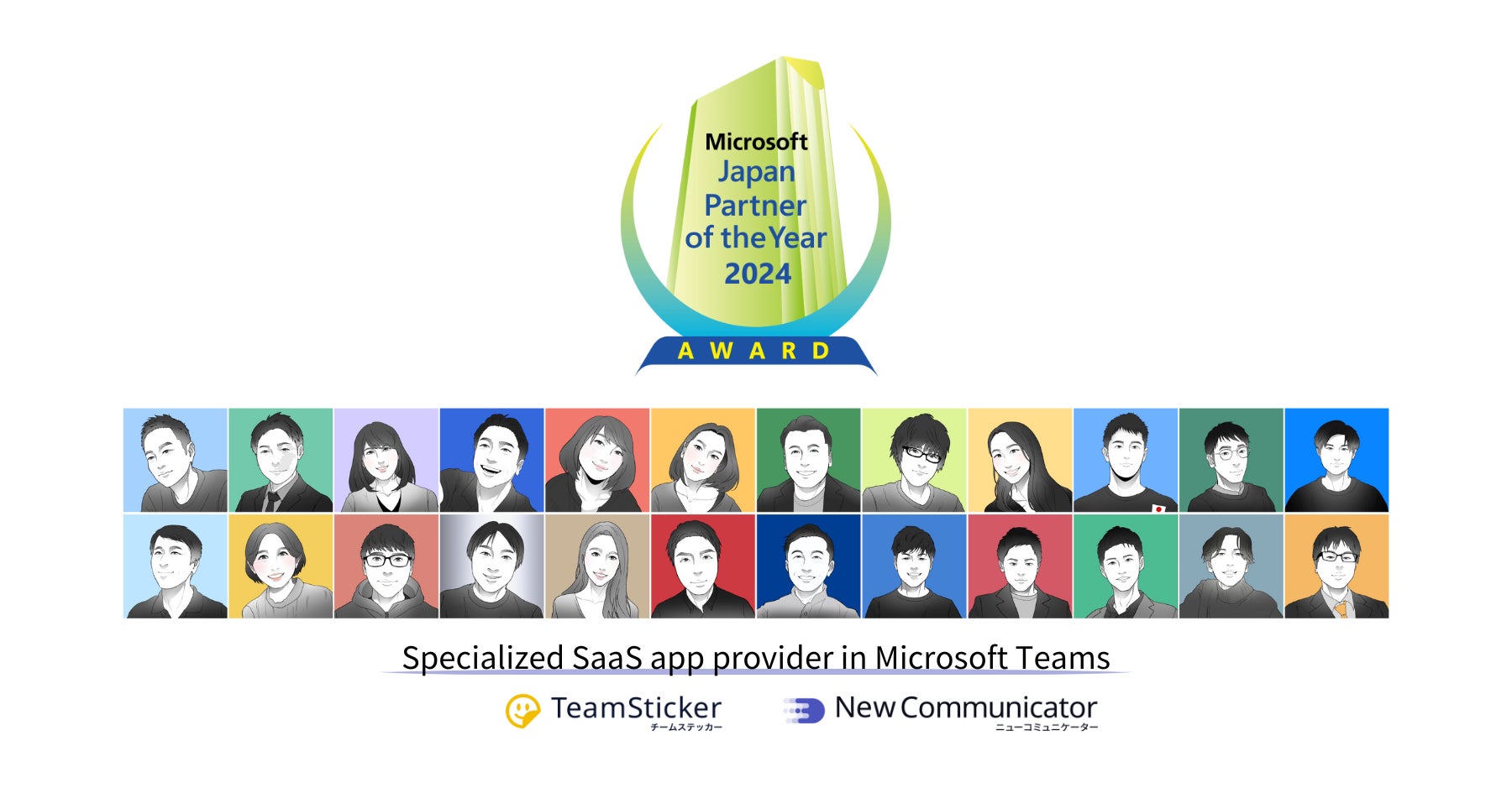 本受賞は、当社の代表的ソリューション「TeamSticker」(以下チームステッカー)および「NewCommunicator」(以下ニューコミュニケーター)の Microsoft Teams(以下、Teams) ユーザー企業様へのソリューション販売・導入実績、特にMicrosoft Market Place経由での日本発海外59か国向けの販売開始と実売実績の積み上げ、更にMicrosoft Corporation(本社:米国ワシントン州、以下、マイクロソフト)が牽引するAIテクノロジーの先進的な活用事例として日本国内の有力連携先との共同ソリューションを実現したことに対する功績など、総合的に高くご評価いただいた結果です。Apps & Solutions for Microsoft Teams は、Teams に関連するアプリとソリューションに関して、顕著な功績を残したISVパートナー企業を年間アワードとして選定されるものです。
