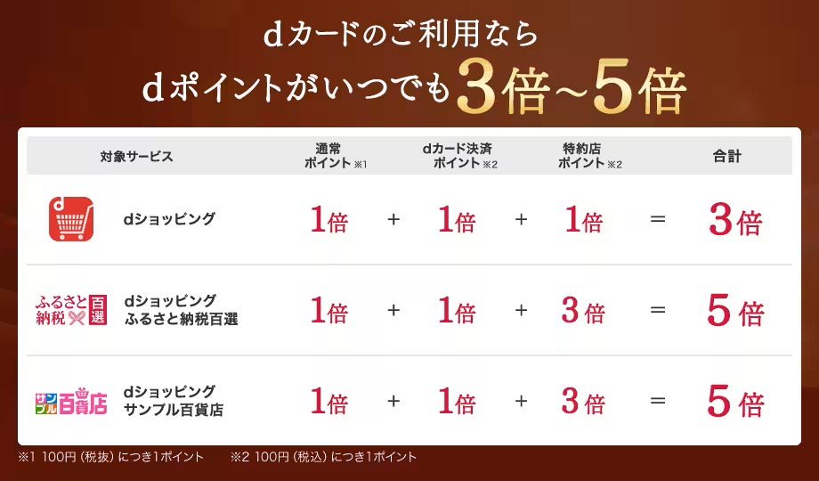 (※2)dショッピングのご利用で100円(税抜)のご利用につきdポイントを1ポイント、dカード決済ポイントとして100円(税込)につきdポイントを1ポイント、dカード特約店ポイントとして100円(税込)につきdポイントを1ポイント進呈するもの