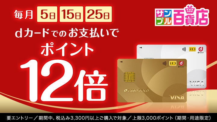 ・「5のつく日限定特約店ポイント」キャンペーン期間中に、送料込・税込で合計3,300円以上、dショッピング サンプル百貨店の商品の注文を行い、当該注文が正常に完了すること