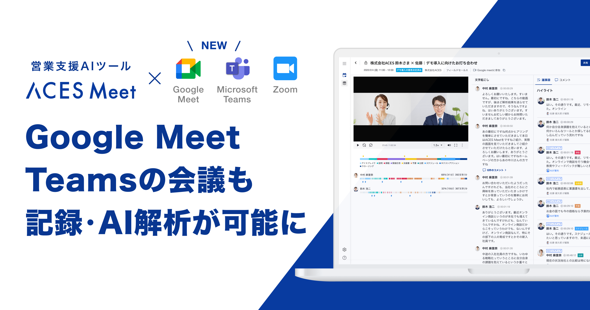 株式会社ACES(東京都文京区、代表取締役 田村 浩一郎、以下「ACES」)は、営業支援AIツール「ACES Meet」においてGoogle MeetおよびMicrosoft Teamsとの連携を開始しました。ACES Meetは2022年3月の正式版リリース時よりZoomとの連携を前提にサービス提供をしてまいりましたが、本連携によってこれまで以上に多くの組織の皆様にACES Meetをご活用いただけるようになります。