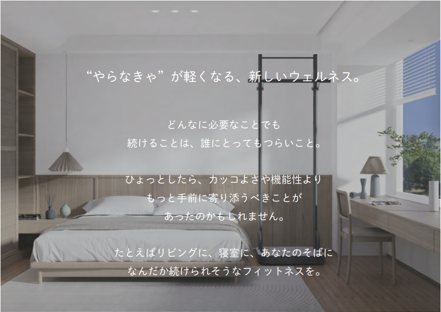 “やらなきゃ”という気持ちが軽くなる、つらくないフィットネス体験を通じて、運動/フィットネスと力を抜いて付き合っていける製品やサービスを提案します。さぁ、“あなたの部屋に、ウェルネスな魔法を”。