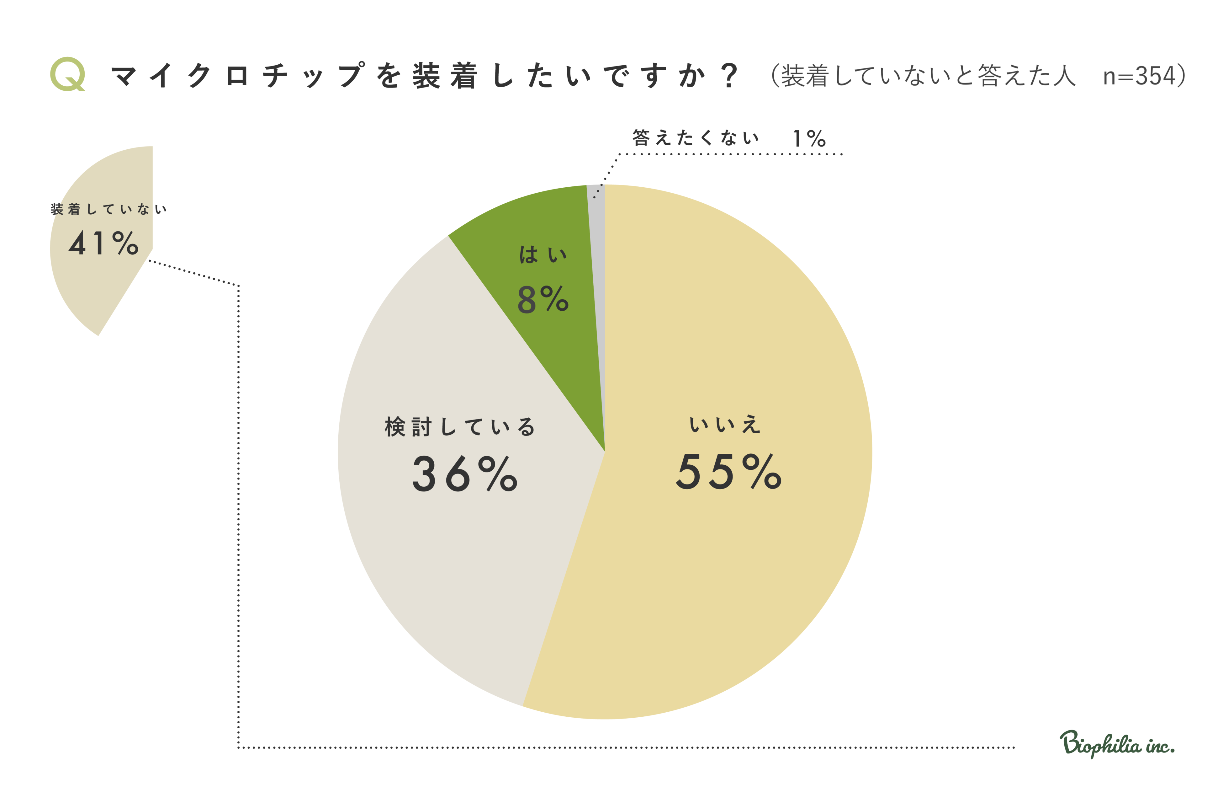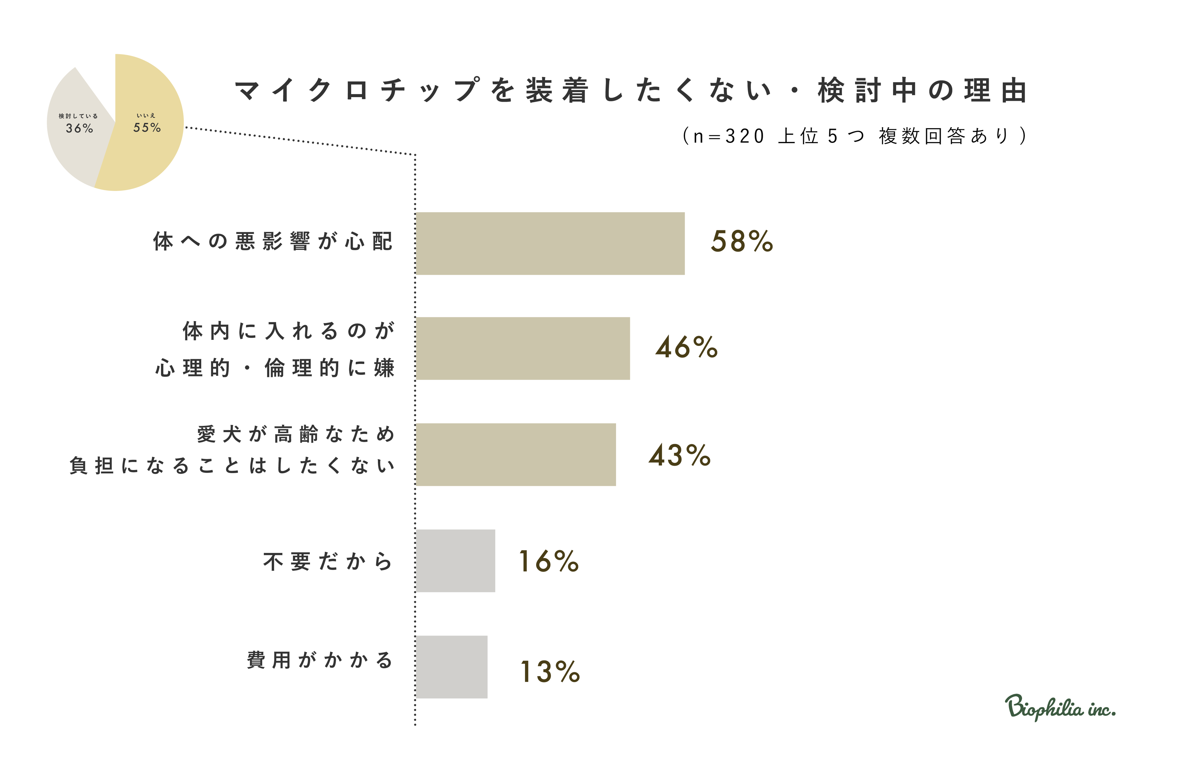 - 装着したくない・検討中の理由は「愛犬の体への影響が心配」が58%、「愛犬の体に入れるのが心理的、倫理的に嫌」が46%