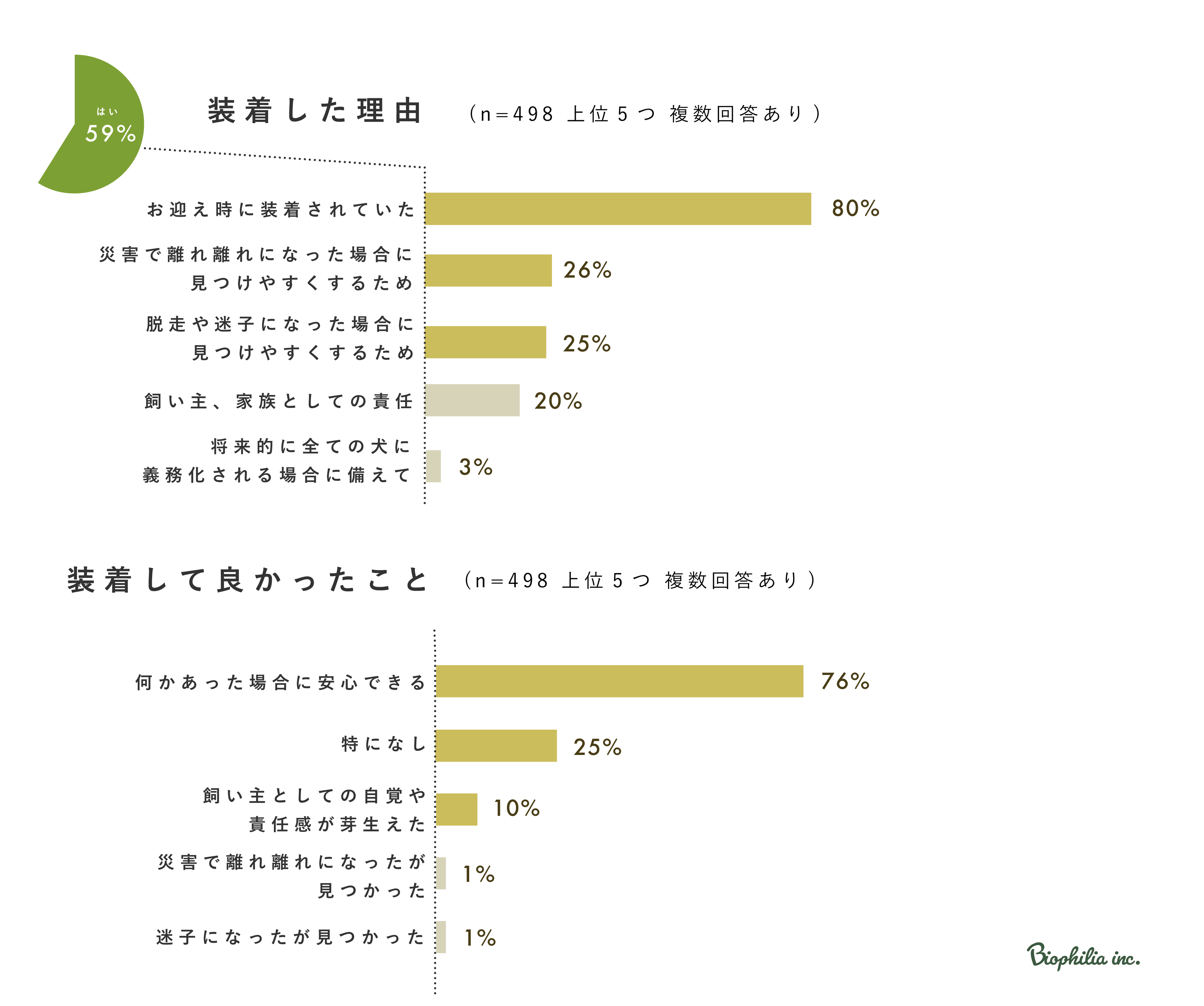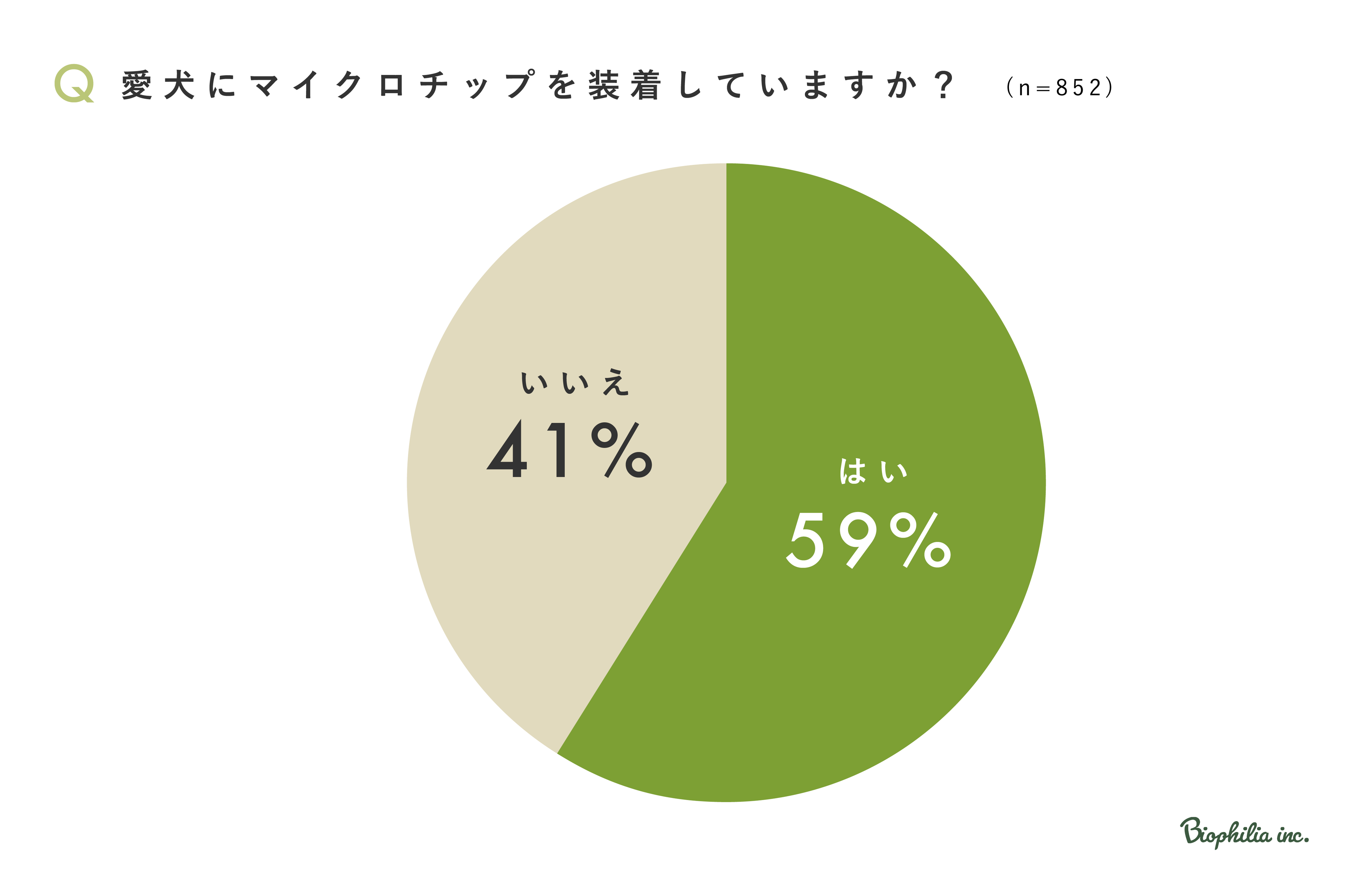- 愛犬にマイクロチップを装着している飼い主は59%。理由は「迎えた時に装着されていた」が80%、次いで「脱走や災害などで迷子になった場合に見つけやすい」と答えた人が合わせて51%