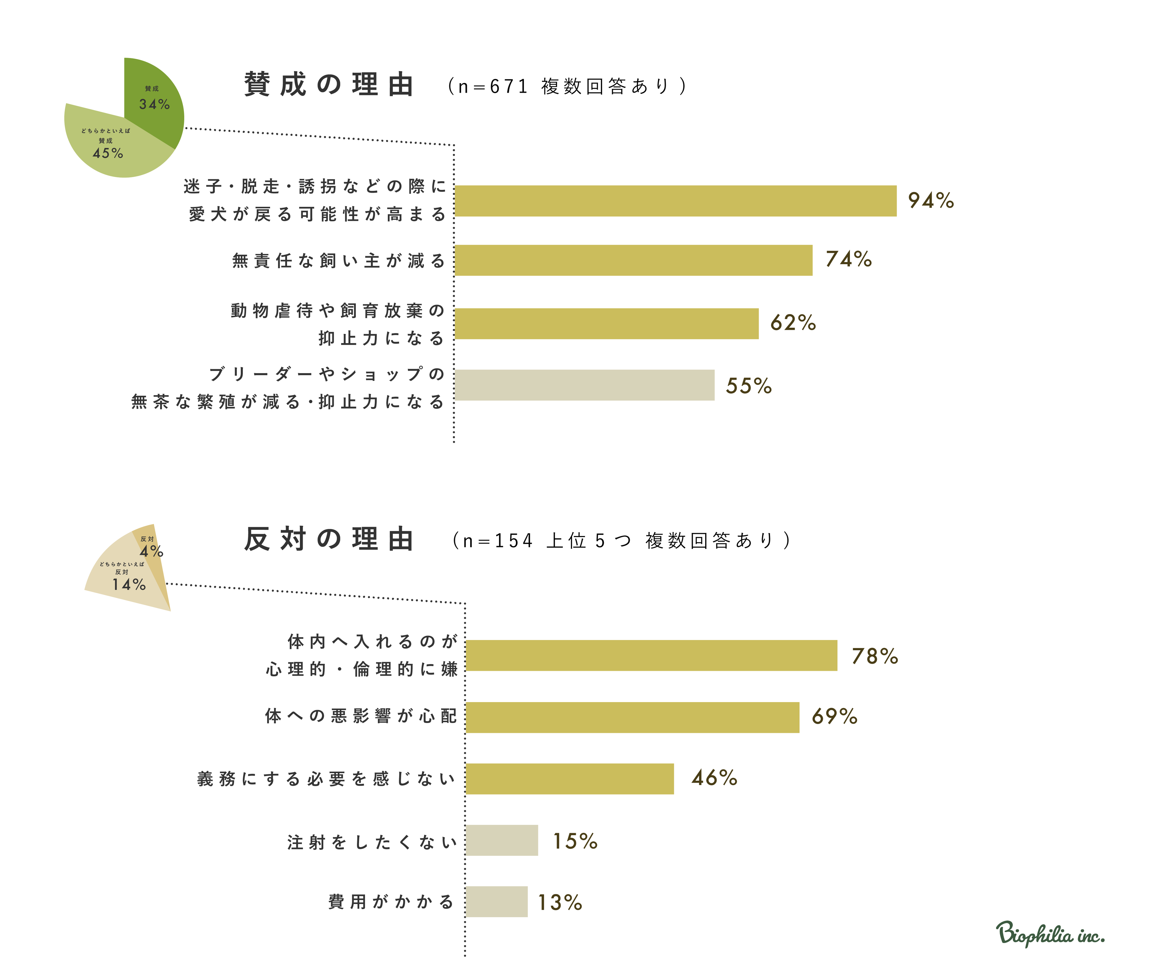 - マイクロチップ義務化に関して動物保護団体の意見は、「迷子犬が飼い主の元に戻る可能性が高まる」「販売業者による無茶な繁殖が減ったり、抑止力になる」「保護すべき犬猫が飼い主に戻され保護できなくなる」という声が多かった