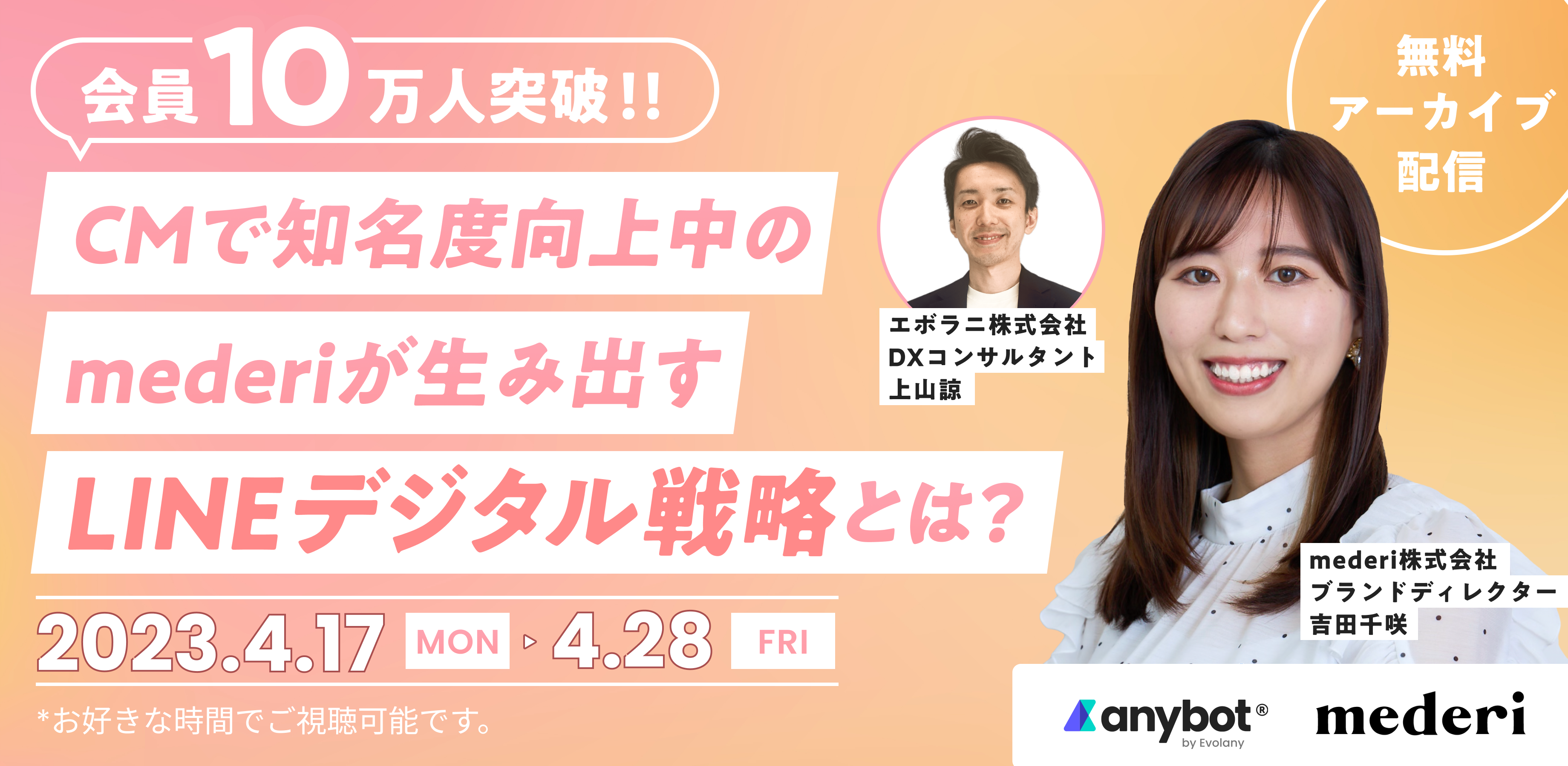 LINEミニアプリやチャットボットで企業や店舗の売り上げアップに貢献する「anybot」(エニーボット)を提供するエボラニ株式会社はこの度、急成長中のフェムテック企業、mederi株式会社と共催で、急成長の裏にあるLINEを駆使したデジタル戦略について、オンラインセミナーを開催します。