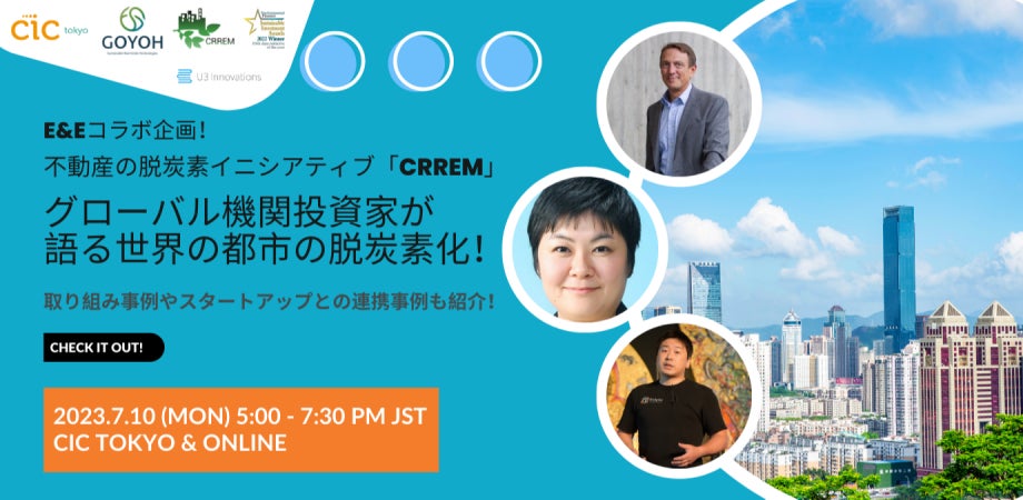 7月10日(月)、CIC Tokyo(虎ノ門ヒルズビジネスタワー15階)にて、株式会社GOYOH、CIC Tokyo 環境エネルギーイノベーションコミュニティ(E&Eコミュニティ)、CRREM(Carbon Risk Real Estate Monitor)は、ハイブリッドセミナー「不動産の脱炭素イニシアティブ「CRREM」: グローバル機関投資家が語る世界の都市の脱炭素化!」を開催します。