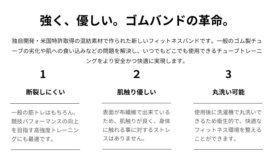VRTX®(ヴィー・アール・ティー・エックス®)のフィットネスバンドは、通常のゴムチューブと比較して断裂しにくく、肌触りが優れた素材(米特許取得・特許番号:US10947646B2)を採用することが最大の特徴です。