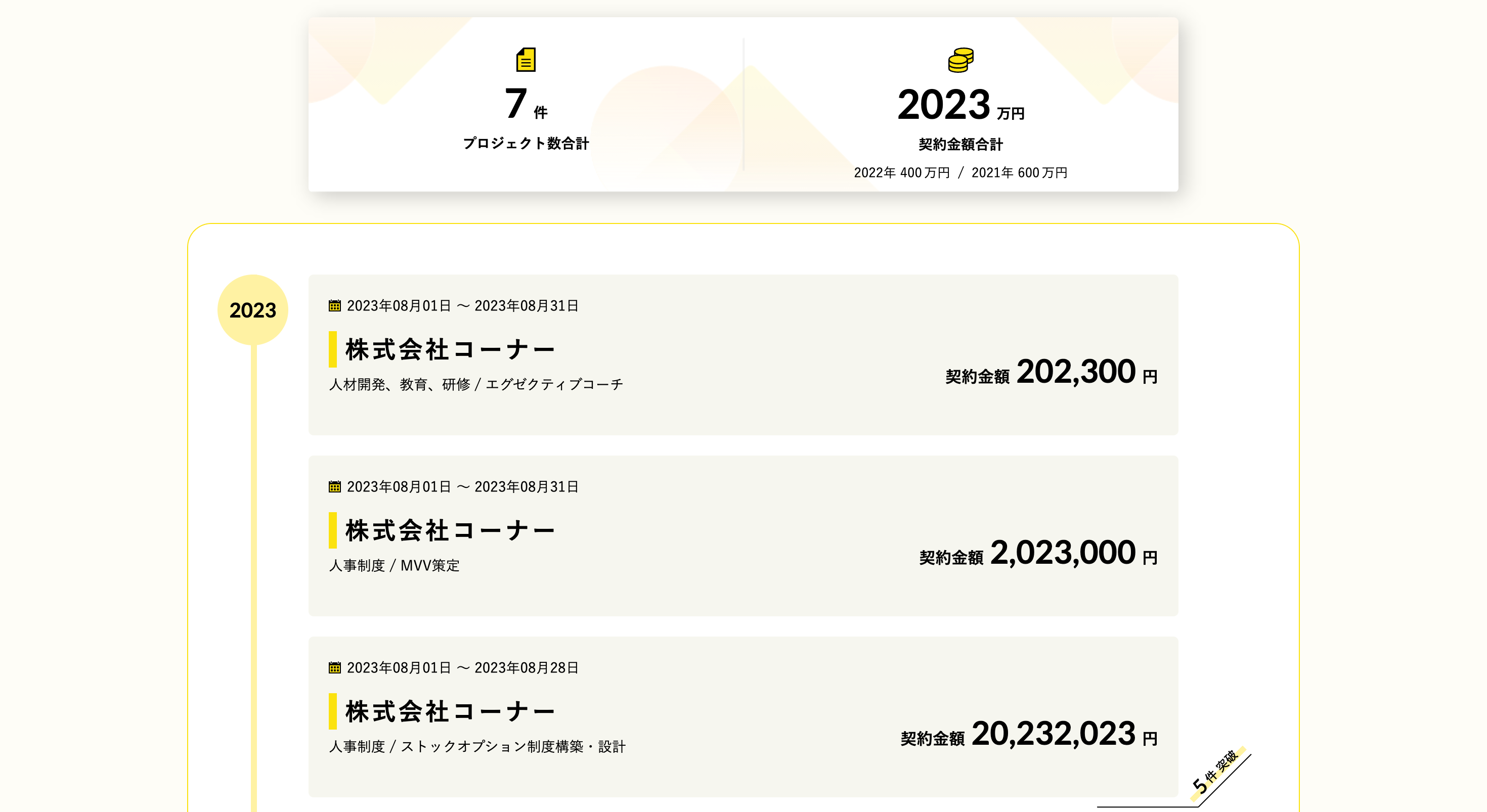 これらにより、過去に携わったプロジェクトを一覧で見ることができ、プロジェクト件数や契約金額の合計などが閲覧できるようになります。